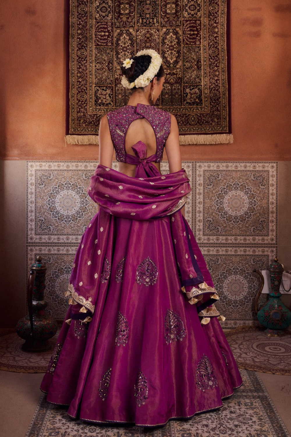 Kapda Dori's stunning purple shimmer tissue silk lehenga, beautifully adorned with intricate resham, dori, sequins, beads and stone work. The purple color adds a touch of glamour and sophistication to your look, while the soft fabric ensures you feel comfortable all day or night long. It is styled with a purple shimmer tissue silk blouse embroidered with resham, dori, sequins, beads and stone work. Pair it with complimenting purple shimmer tissue silk embroidered dupatta.
