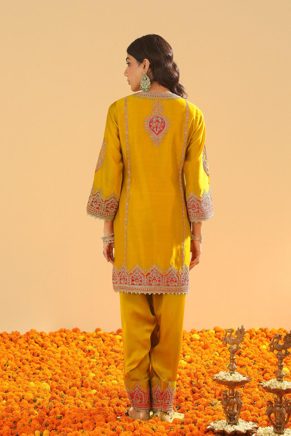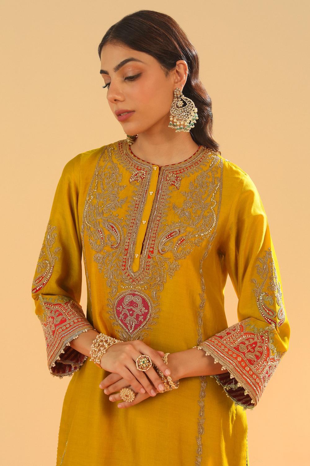 This ensemble is made in pure silk chanderi fabric teamed up with a dogri salwar and a silk organza dupatta. the outfit is having a zero neck with placket and straight sleeves. the outfit is adorned with exquisite kirandori with sitaara and dabka zardozi. the outfit is finished with a contrast banarsi and kinari.