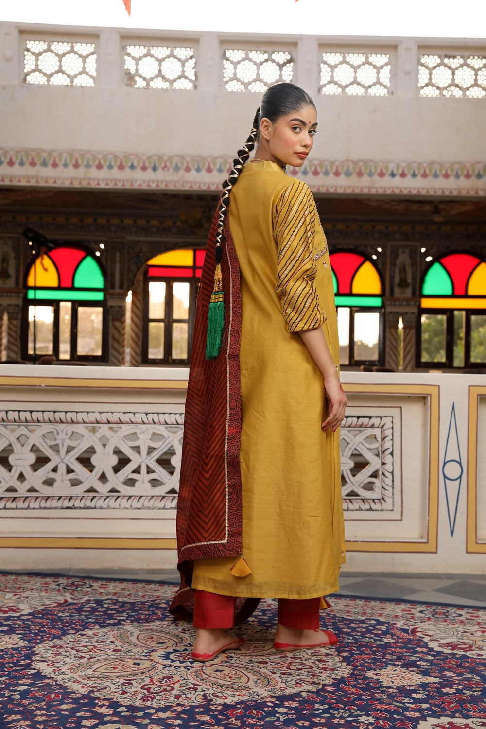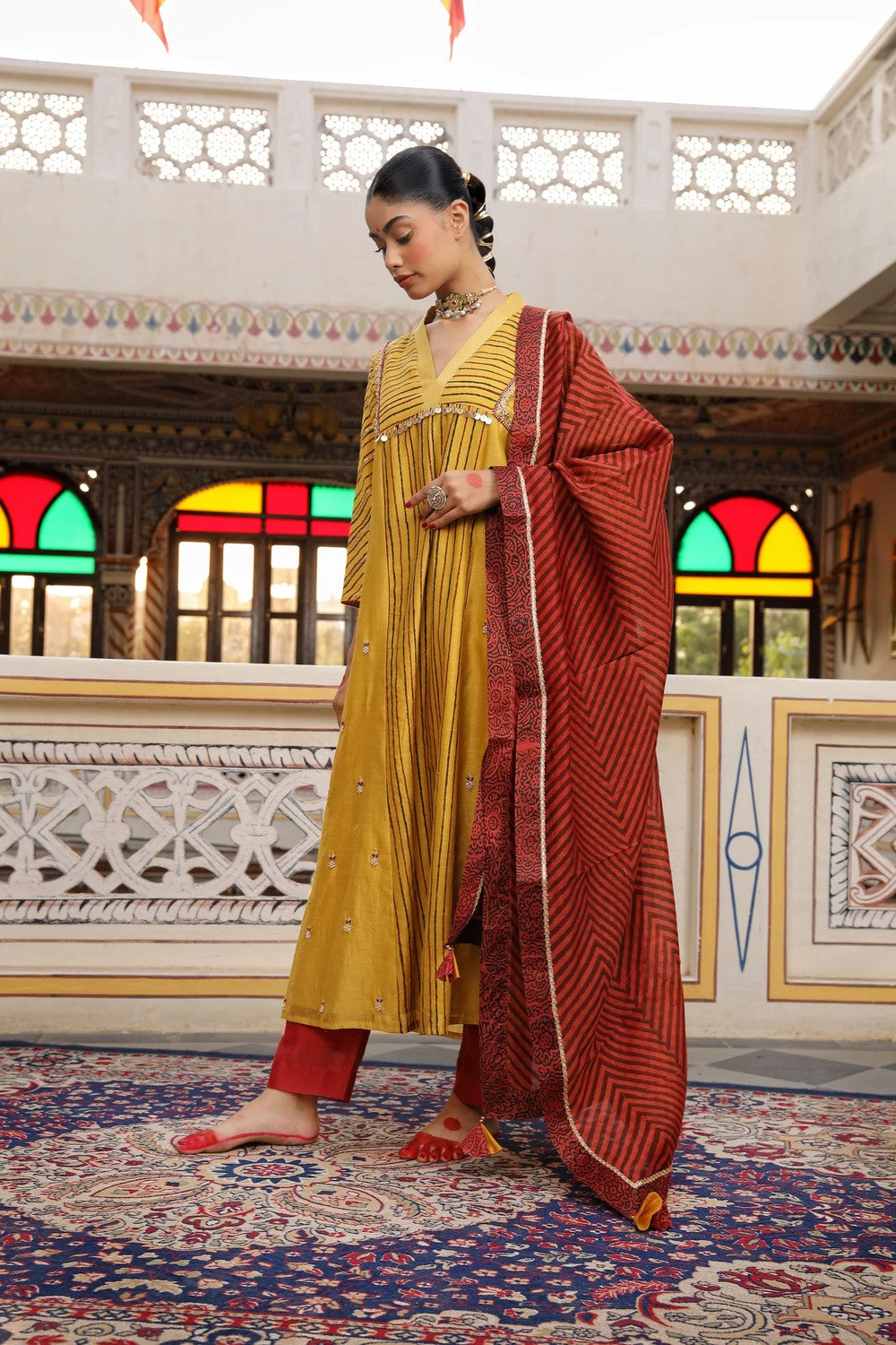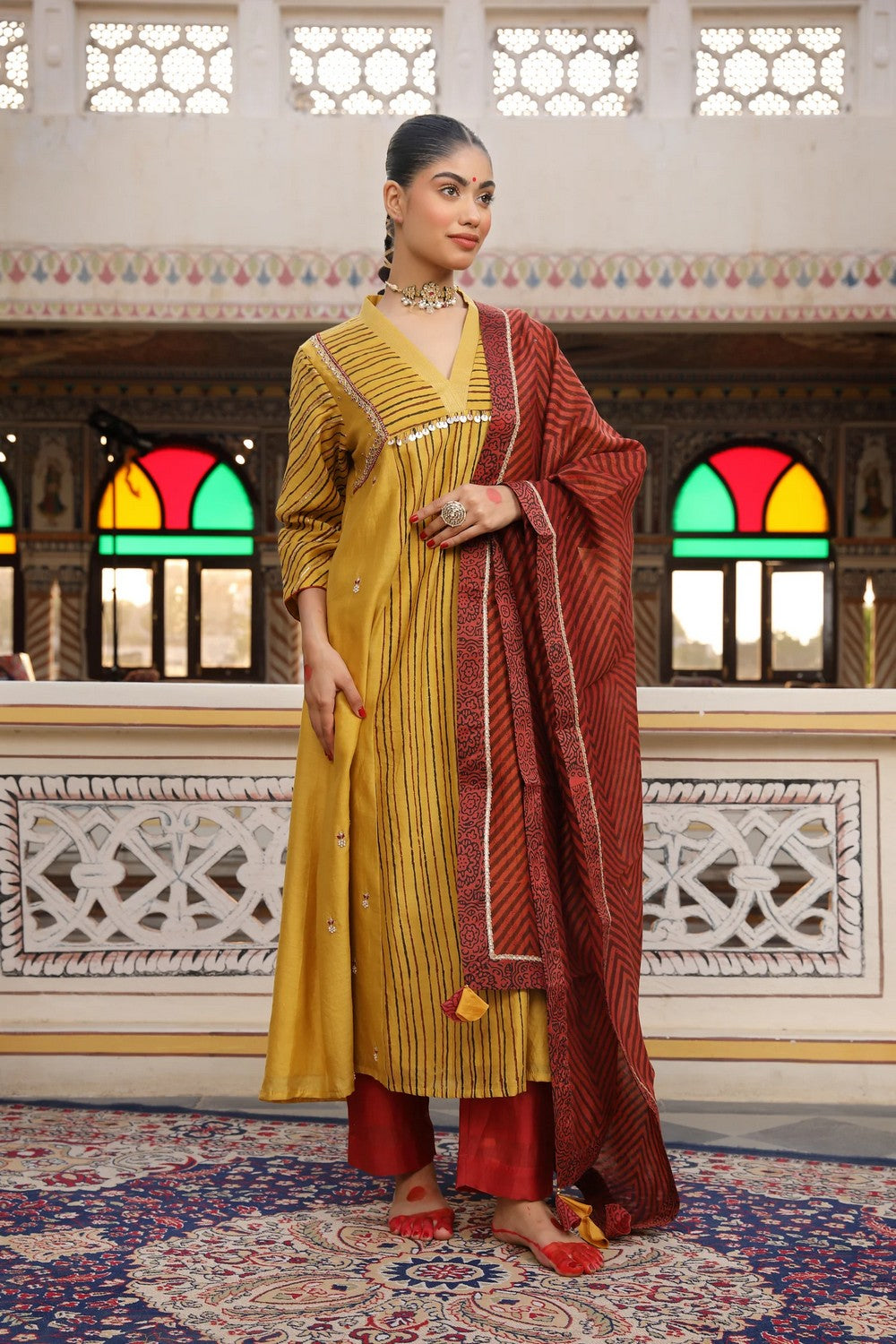 Introducing the elegant Mishri Gold Yellow Suit Set, crafted from a luxurious blend of block-printed and plain silk Chanderi, lined with soft cotton for a comfortable, relaxed fit. The kurta features a flattering V-neckline and is adorned with intricate handwork, including zardosi, bead, thread, and pearl embroidery, enhanced with delicate gota detailing. Paired with matching pants and a coordinating dupatta, this three-piece set is a perfect choice for festive celebrations and special occasions.