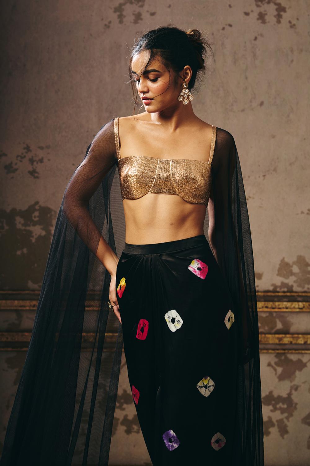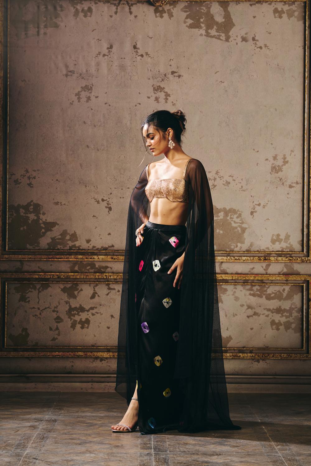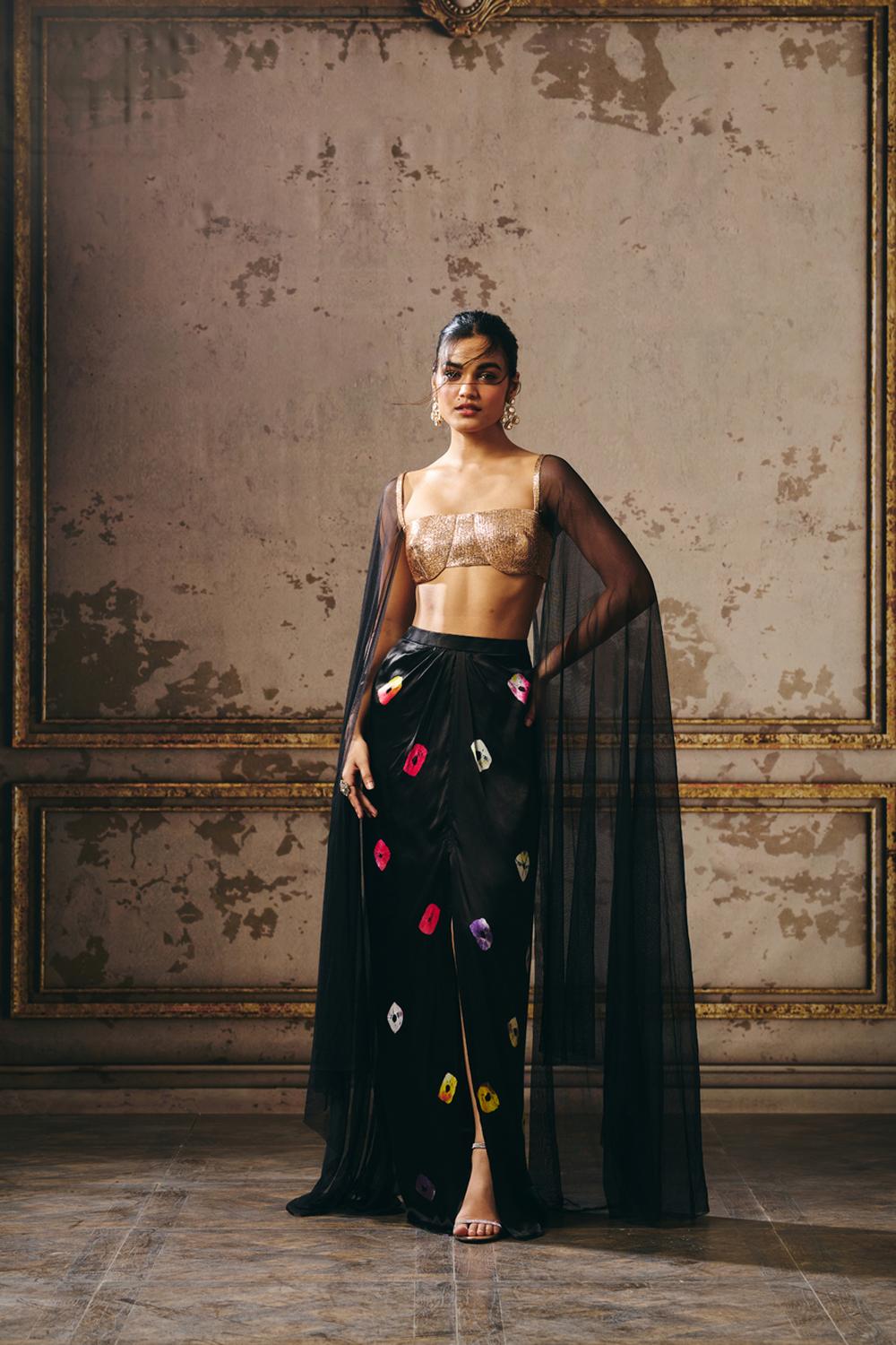 Black Shibori Skirt With Rose Gold Blouse With Cape