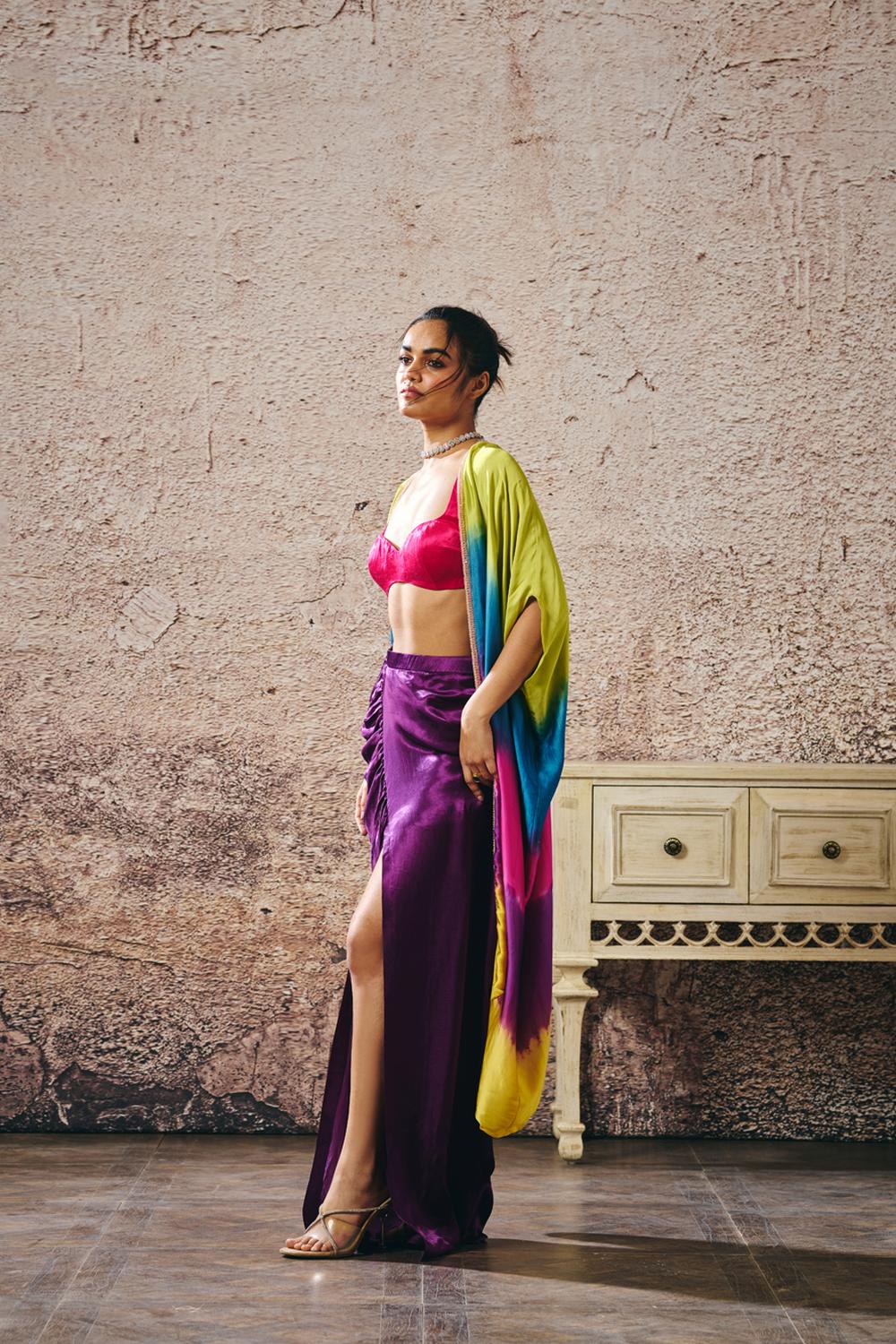 Hot Pink Blouse And Purple Skirt Withombre Shrug