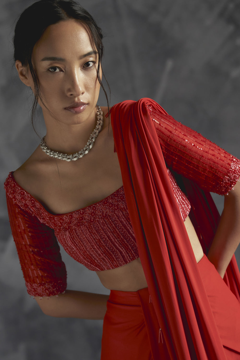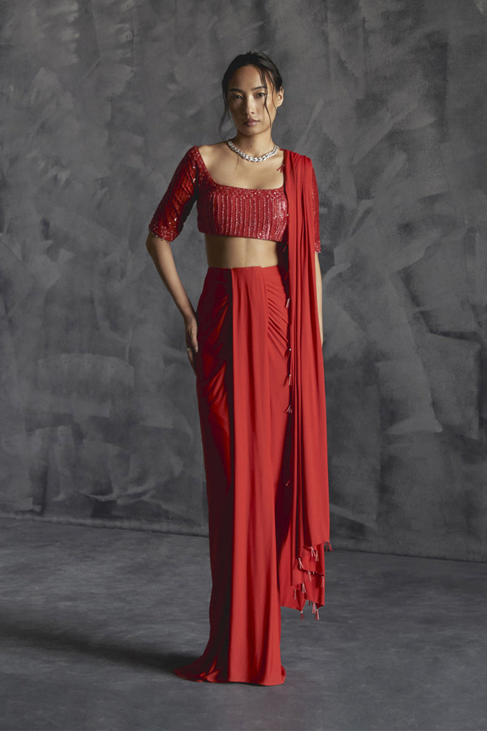 Pleated Draped Skirt With Embelished Elbow Sleeve Blouse