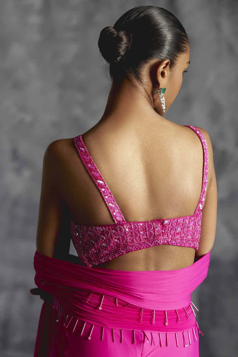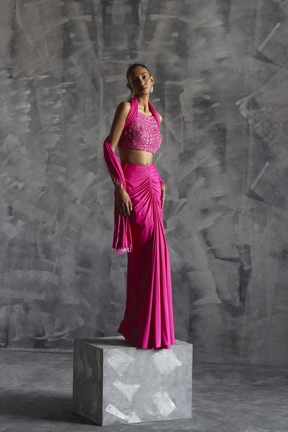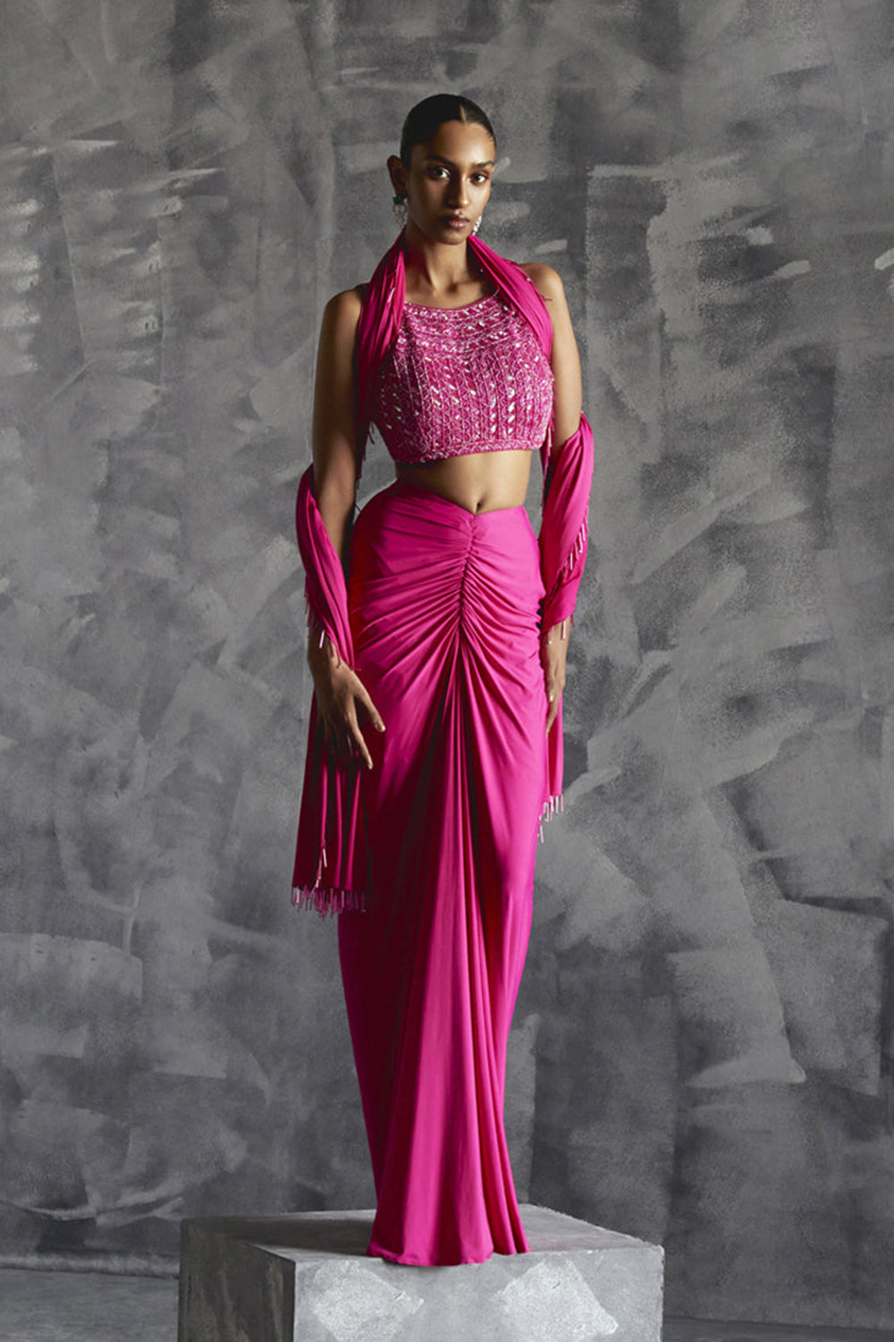 Gathered high waist skirt with halter style hand embroired blouse, come with dupatta with embelished hem detail