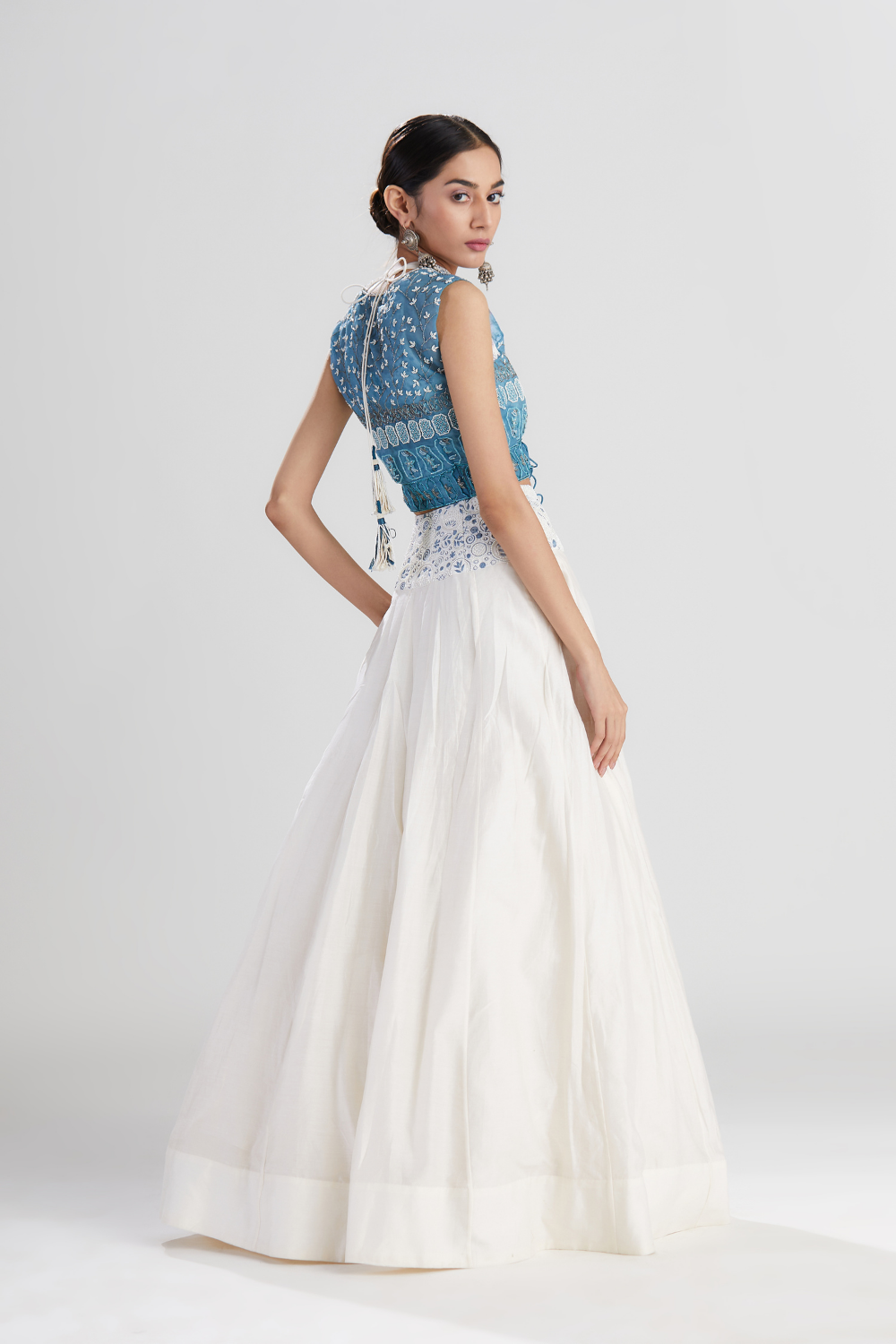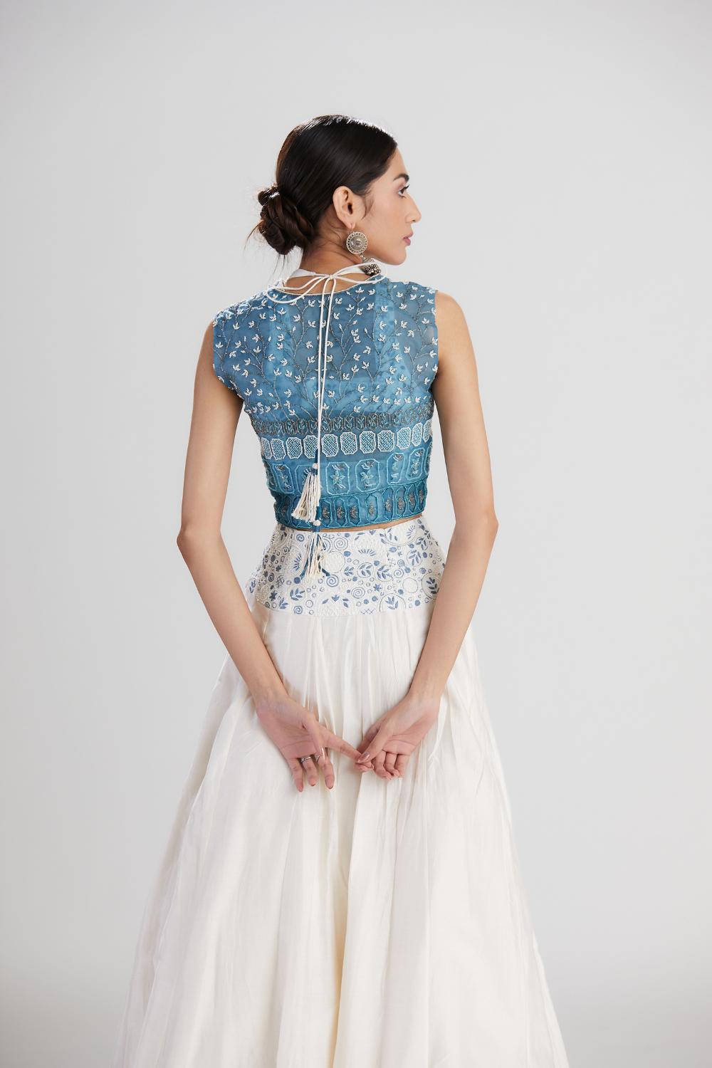 Specification: hand-embroidered touch neck blouse in silk chanderi,hand-embroidered short jacket in silk organza, high-waisted skirt in silk chanderi with embroidered waist band,model is 5 feet 7 inches and is wearing a small size