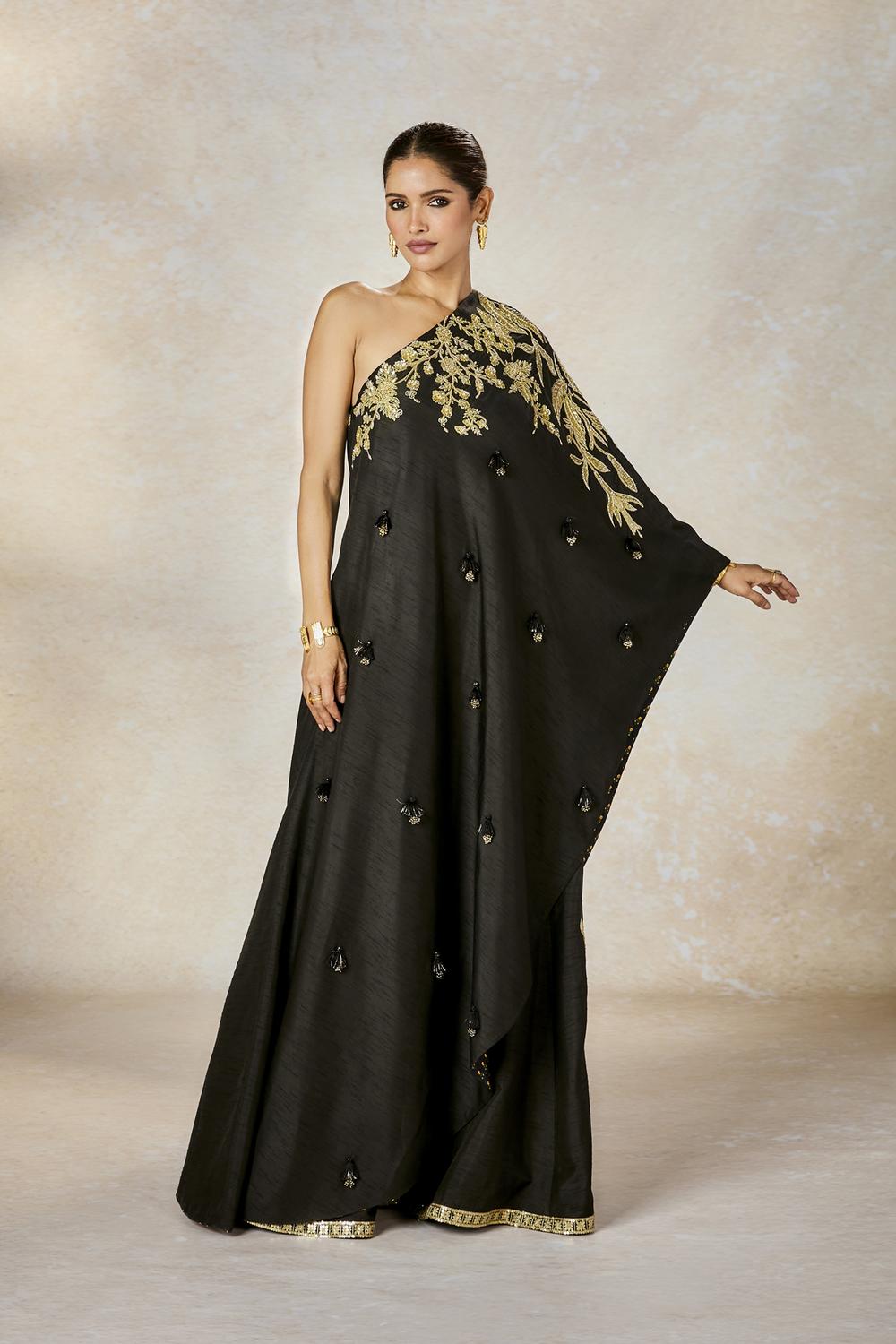 "introducing the raat rani one shoulder set, a fusion outfit that blends traditional artistry with contemporary style. this captivating ensemble features a one shoulder top, richly embroidered with zardozi and moti work, reflecting the opulence of indian craftsmanship. it is adorned motifs like the 'kusum kali', symbolizing grace and natural beauty, making this piece truly one-of-a-kind. the ensemble is completed with an embroidered sharara. the raat rani one shoulder set is perfect for those who seek to make a statement with timeless elegance and a touch of whimsy, ideal for weddings, festive occasions, or any event where you wish to stand out with grace and charm."