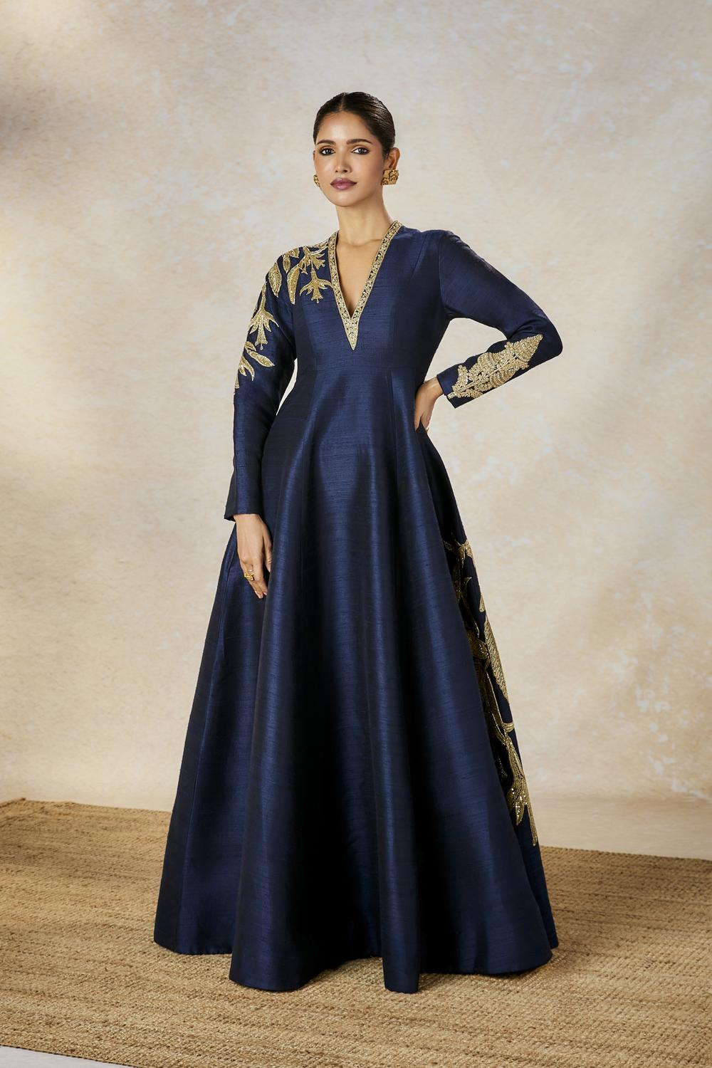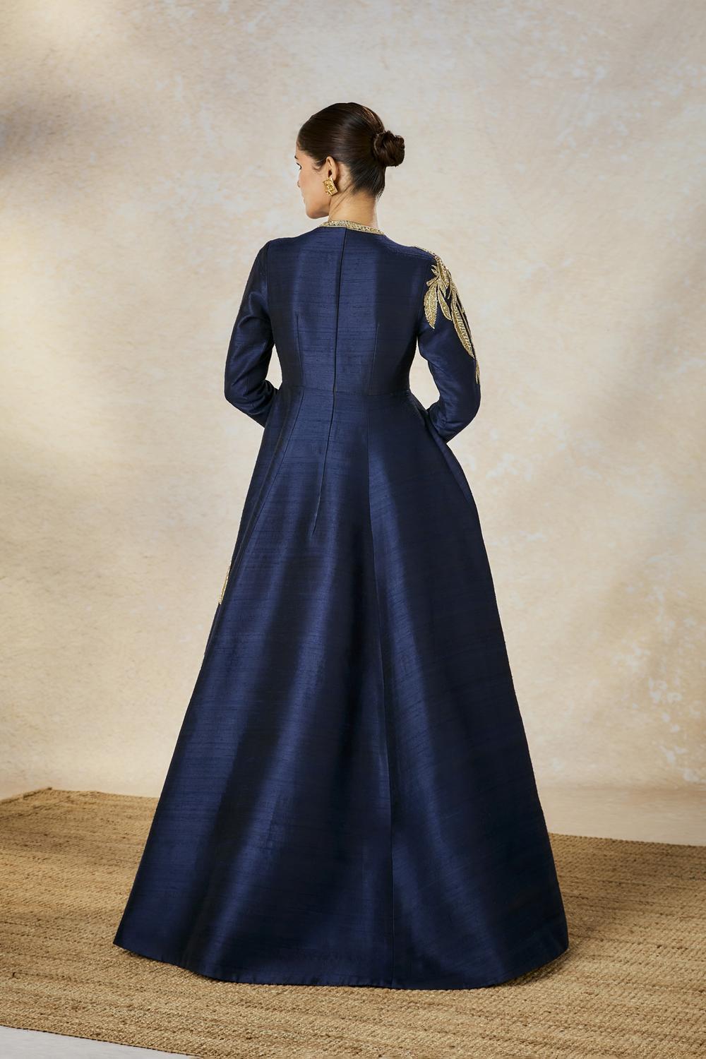 The neeltara gown is a testament of true artistry. a silk gown with dramatic scattered motifs of 'kusum kali' covering the bodice. these motifs create a medley like no other, they are brought to life with the age old craft of zardozi, sitara and moti chala embroidery making this ensemble a standout at any occasion.