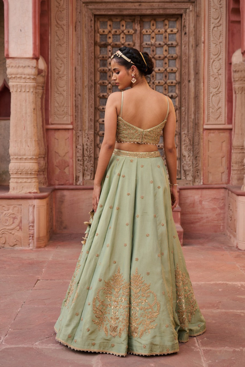 Kapda Dori's stunning mint green shimmer tissue silk lehenga, beautifully adorned with intricate dori, sequins, pearls and stone work. The mint green color adds a touch of glamour and sophistication to your look, while the soft fabric ensures you feel comfortable all day or night long. It is styled with a mint green shimmer tissue silk blouse embroidered with dori, sequins, pearls and stone work. Pair it with complimenting mint green shimmer tissue silk embroidered dupatta.