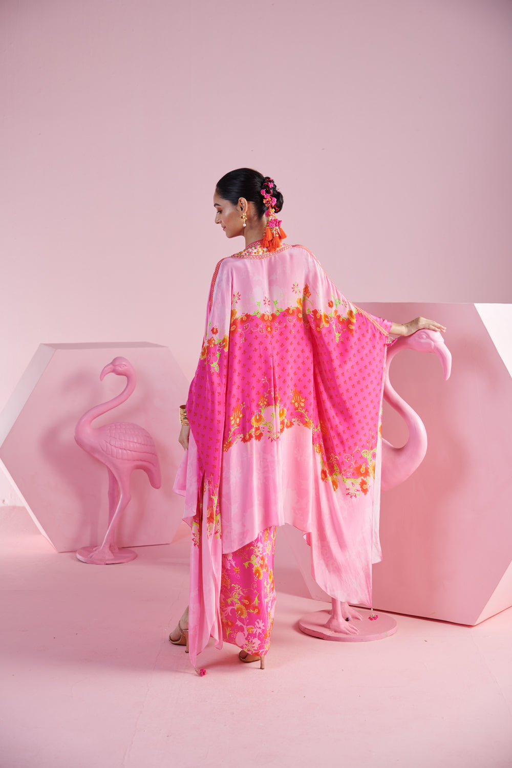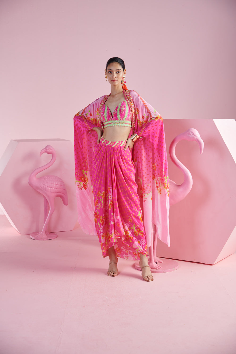 Discover the perfect blend of elegance and playfulness with the blossom cluster 3-piece set. this stunning ensemble features a vibrant pink and green printed blouse that adds a touch of floral charm to your look. paired with a gracefully draped skirt, the set creates a flowing silhouette that moves beautifully.the shrug and the blouse has very beautiful embroidery detail which brings all life to the set. the printed shrug completes the outfit, offering an extra layer of sophistication with its complementary patterns. ideal for any special occasion or a chic day out, this set combines stylish prints and versatile pieces for a standout wardrobe addition.