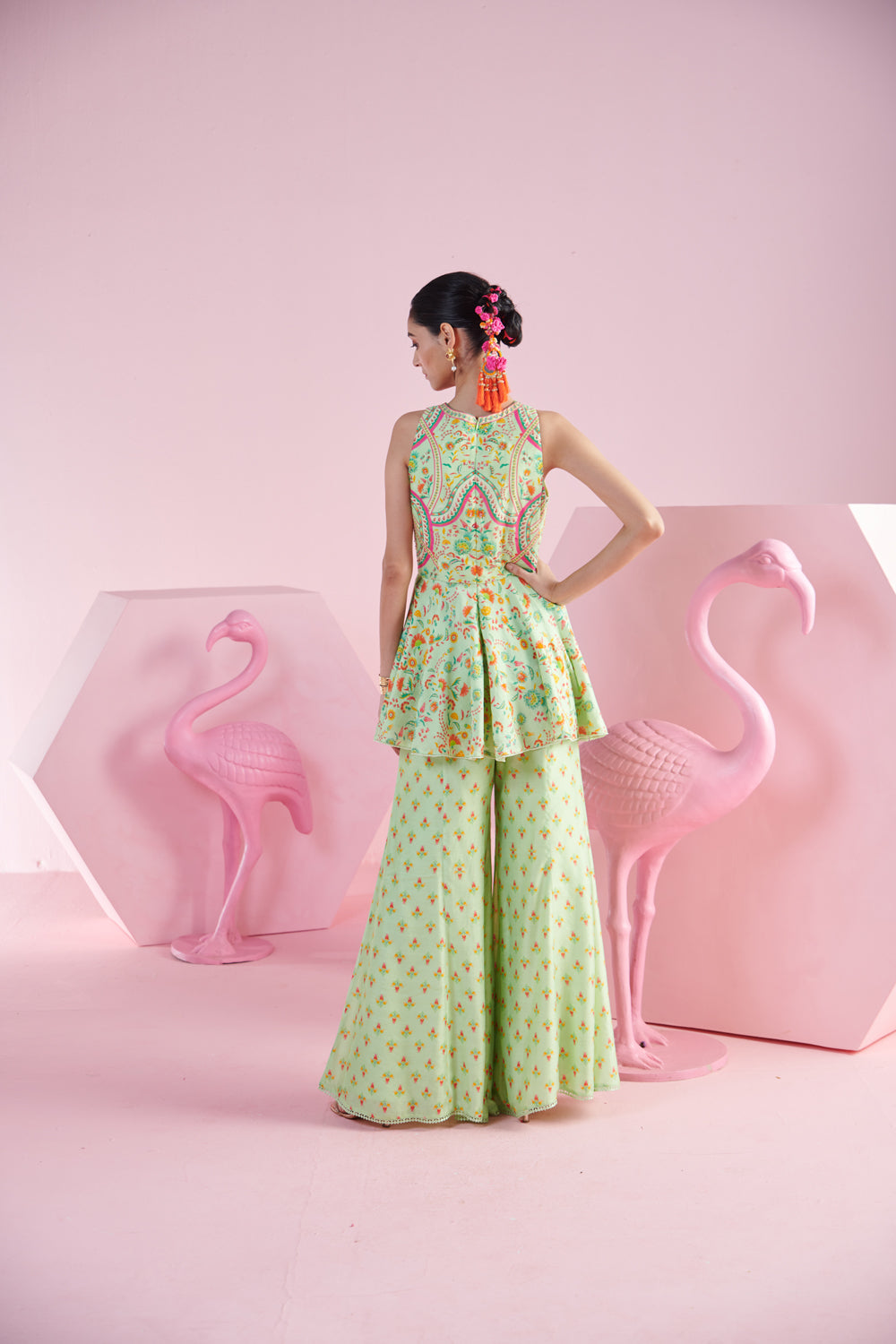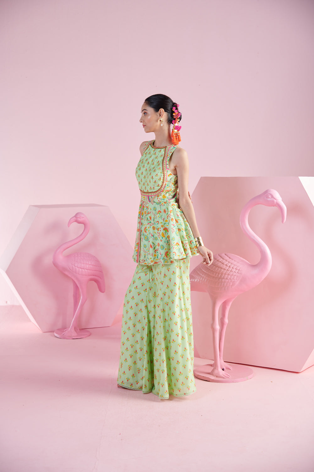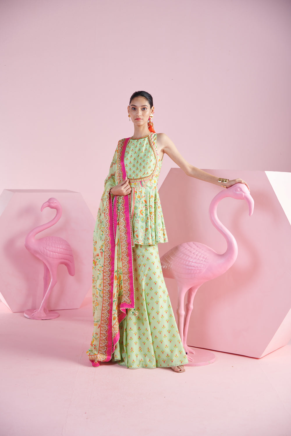 Embrace timeless sophistication with the pistachio elegance ensemble. this refined set features a pista green peplum top that offers a flattering, structured silhouette with a touch of playful flare and embroidery detail. paired with flowy flare pants, the outfit combines comfort with chic style. completing the look is a luxurious iznik printed dupatta, known for its intricate patterns and vibrant colors that add a statement touch to the ensemble. perfect for elegant occasions or festive events, this set effortlessly blends contemporary design with traditional charm.