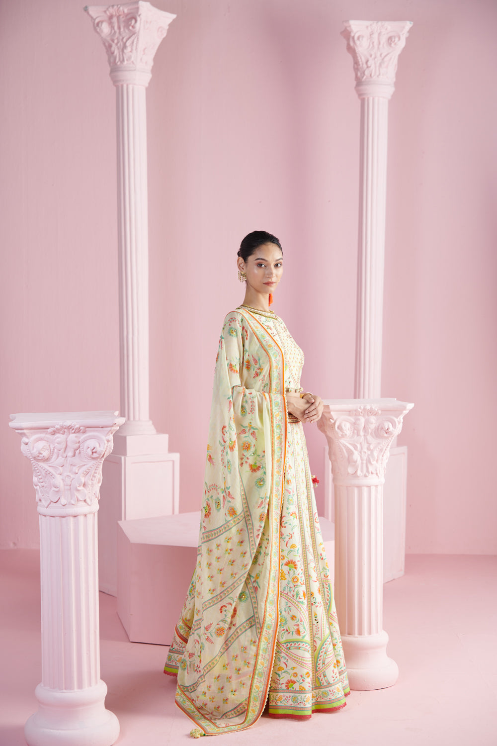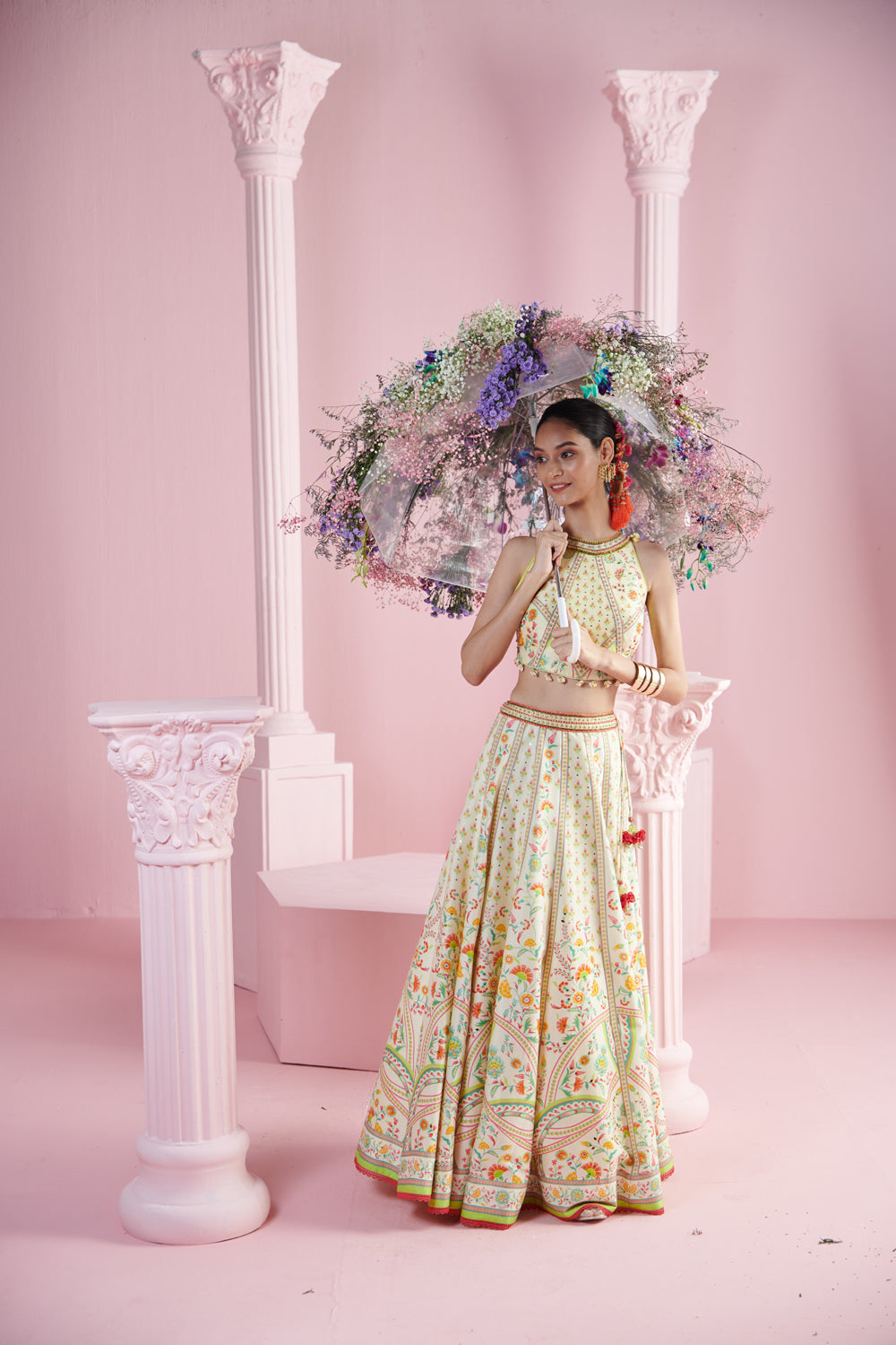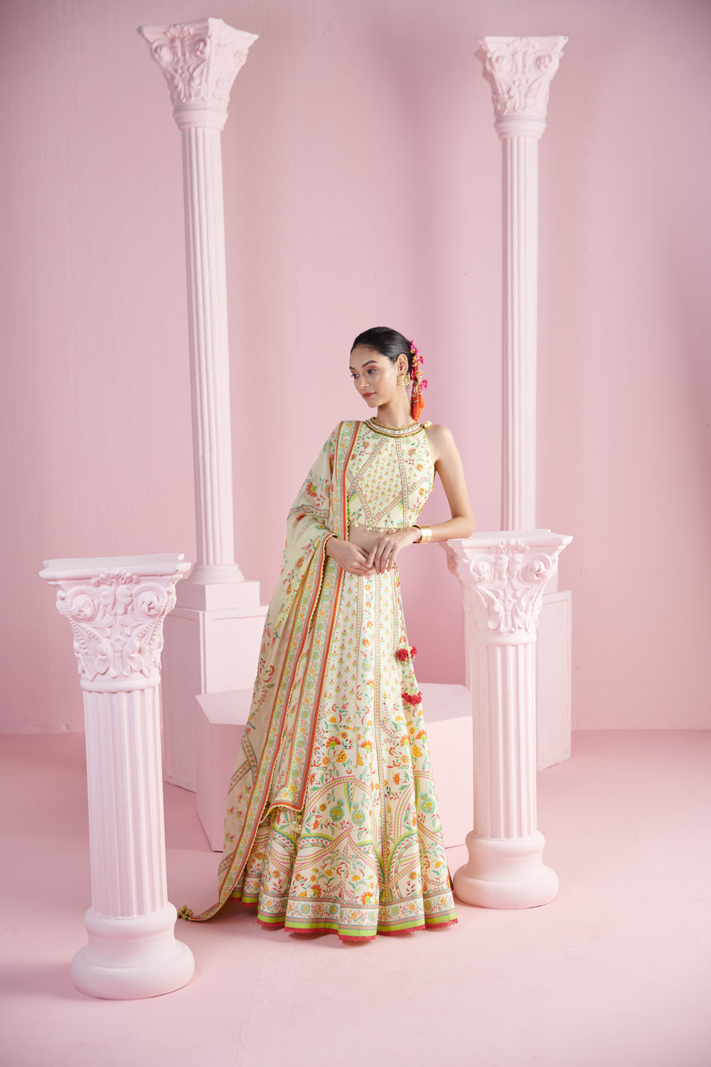 Illuminate your look with the lemon blossom ensemble, featuring a radiant lemon yellow printed top that exudes a fresh and vibrant charm. the top pairs beautifully with a coordinating lehenga, designed to create a flowing and graceful silhouette. the set is completed with a printed dupatta, adding an extra layer of elegance and intricate design. ideal for festive occasions or special celebrations, this outfit combines bold color and delicate prints to create a striking and sophisticated appearance