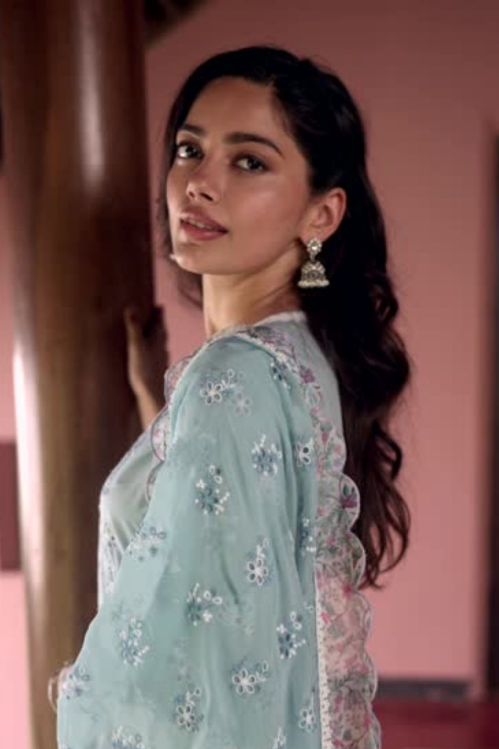 The matching straight-fit pants and the sheer dupatta, graced with subtle floral patterns and scalloped lace borders, completes the ensemble. Ideal for daytime gatherings or festive occasions, this kurta set captures the essence of understated luxury and effortless style.