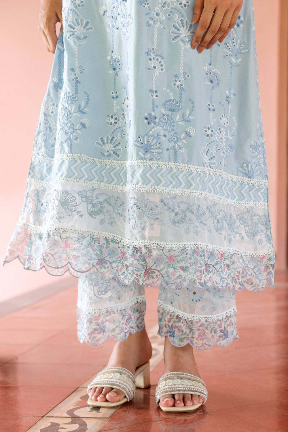 This powder blue cotton kurta set is a breath of fresh air for your summer wardrobe. The kurta’s delicate tonal floral motifs exude a serene and feminine vibe. Intricate lace detailing adorn the neckline and sleeves. Made from lightweight cotton, it promises breathability and ease, making it perfect for warm days.
