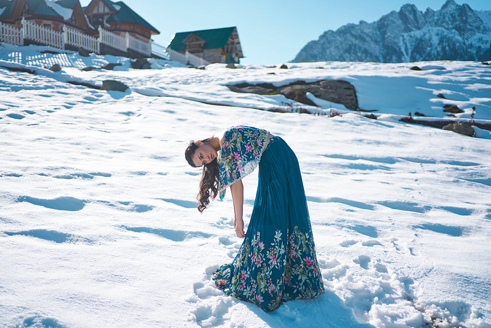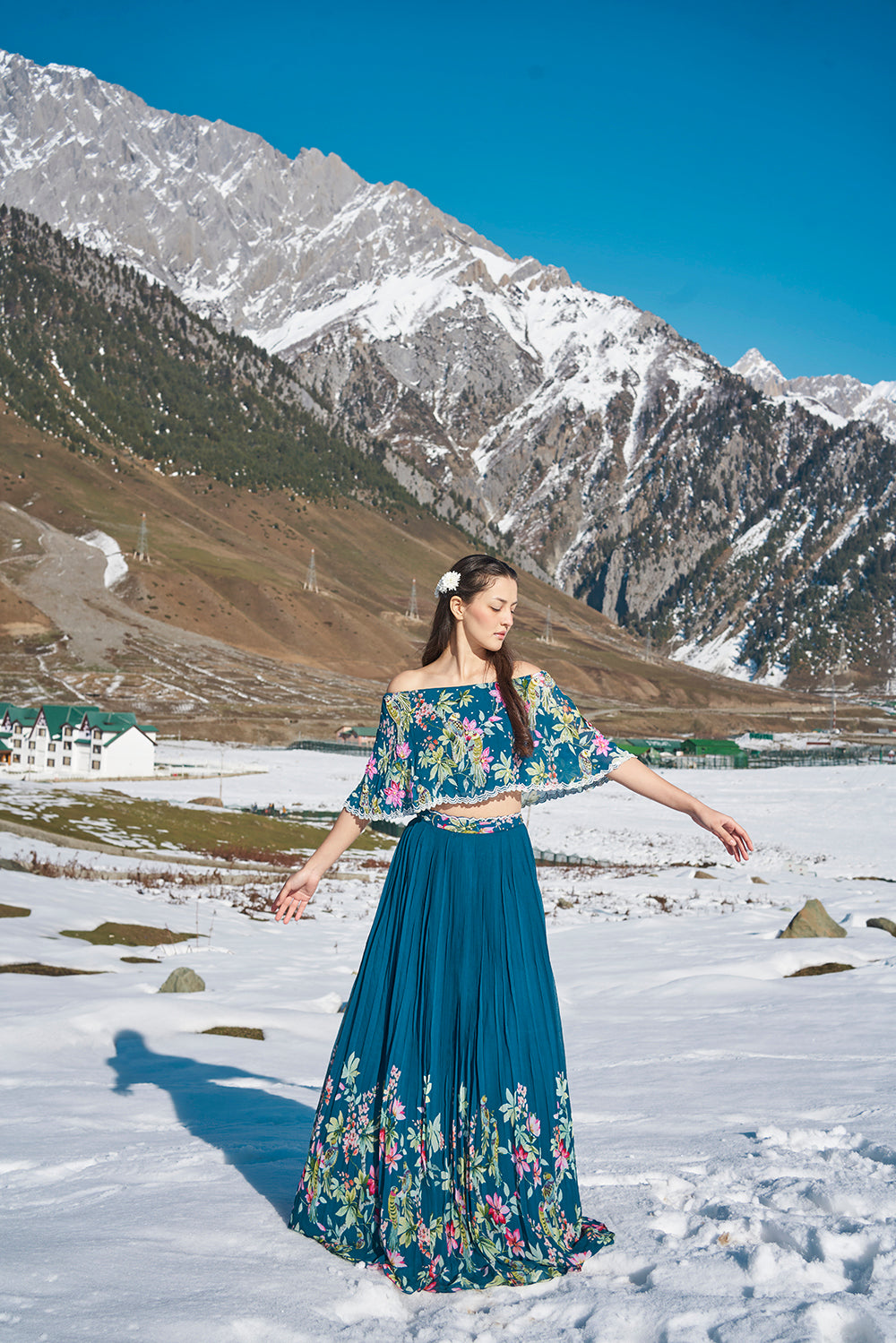 navy blue floral hand emdroiderd off sholulder cape blouse with pleated lehanga made in georgette fabric