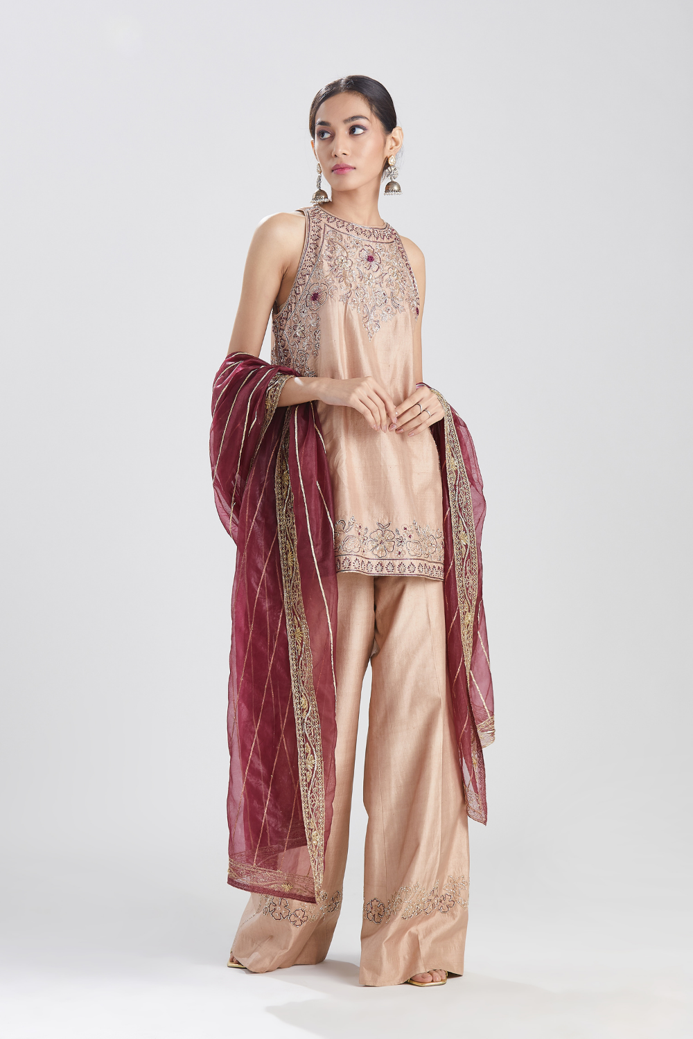 This straight kurta in Nude pink features a bouquet of flowers and foliage around the borders and the neckline. It has a opening at the back with hand embroidered buttons wand hand embroidered diamond border on the sides. It is paired with high waisted flared pants and our angoori dupatta with floral Embrodiery along the border. It also features linear gota Embrodiery through out