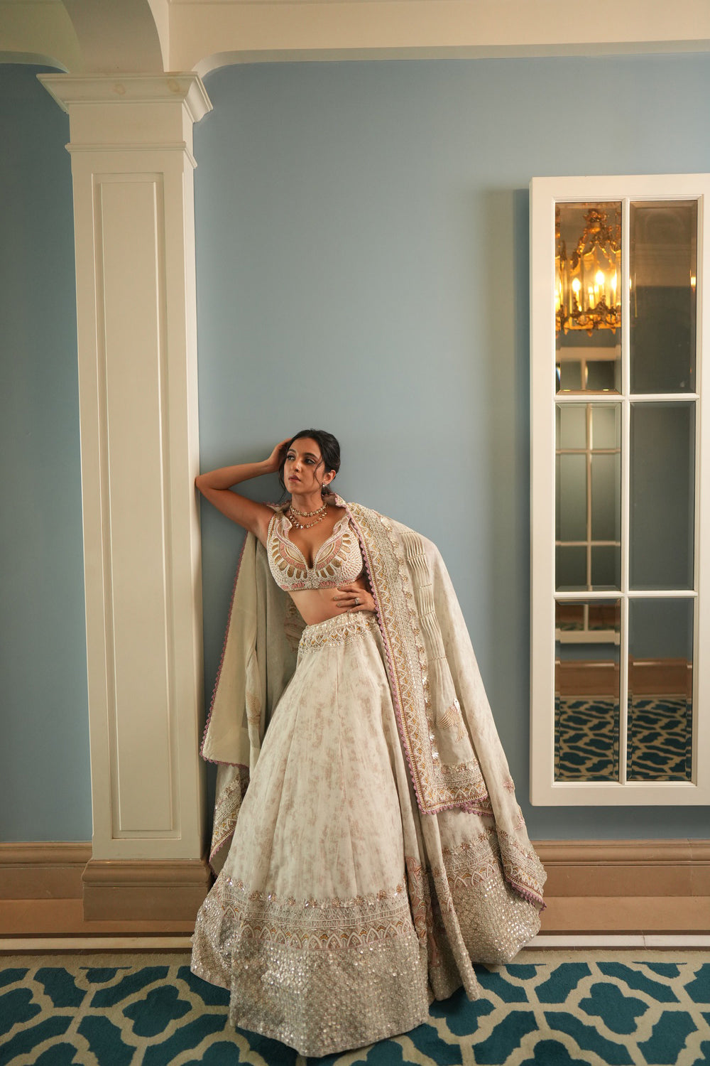 An ivory lehenga in silk base with tiger hand embroidery. it is paired with a peacock blouse and an oversized dupatta having peacock mandala details. the tiger bridal lehenga is perfect to wear on the wedding day or for the engagement day