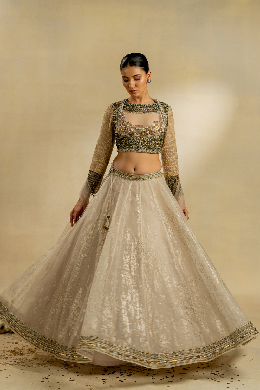 An ivory foiled organza lehenga and blouse detailed with resham, cutdana and zardozi work.