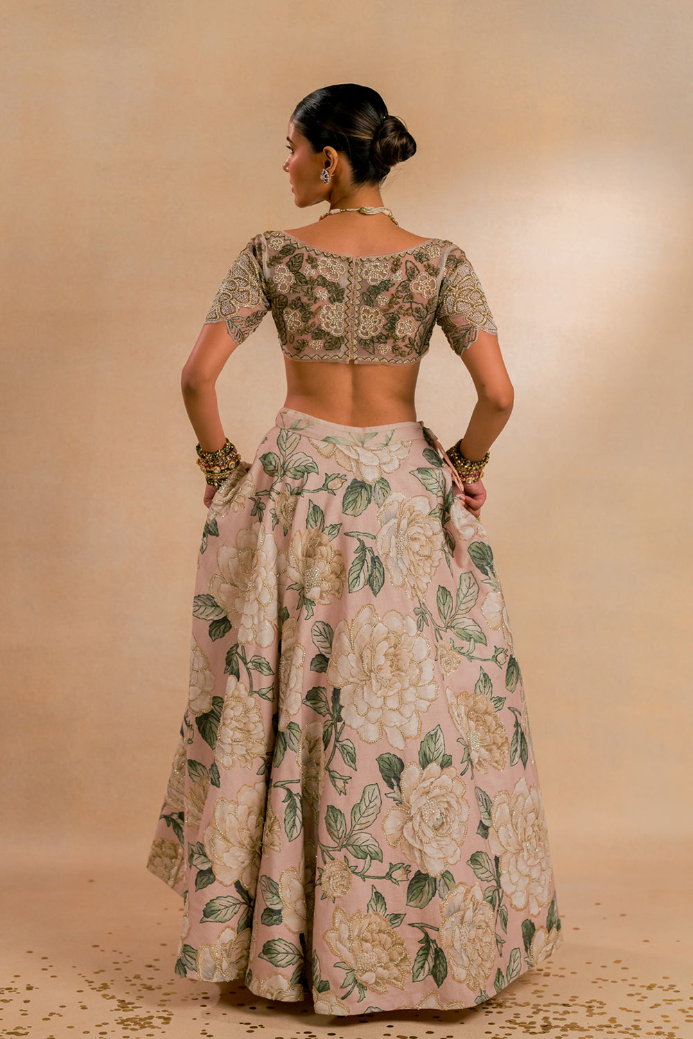 An ivory jacquard fabric lehenga, blouse and net dupatta.hand embroiderd with pitta work in shades of olive green and pink with tikkis and pearls