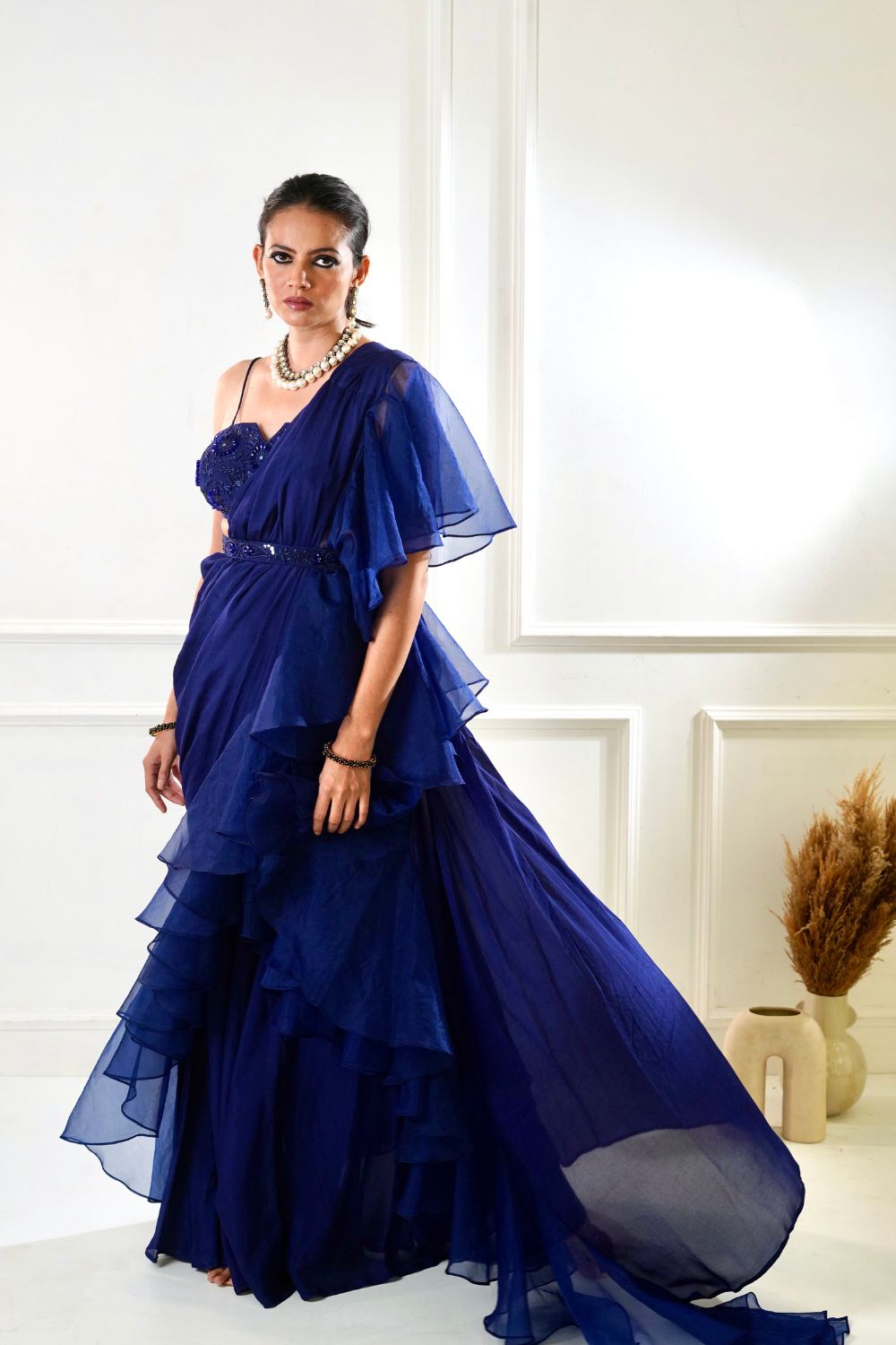Chiffon blouse with Chiffon and Organza Ruffle Saree with belt