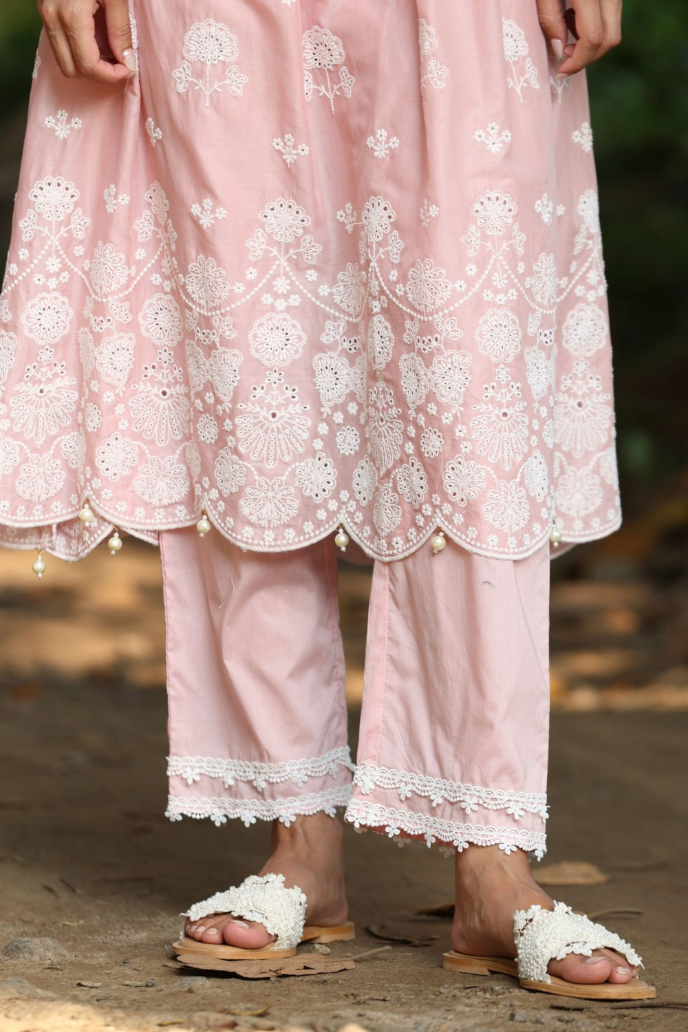 Embrace the soft allure of summer with this pastel pink cotton Anarkali set, a perfect blend of grace and comfort. The Anarkali is crafted from breathable cotton and adorned with delicate white thread embroidery. The notched V-neckline and scalloped sleeves are accentuated with lace and embroidery detailing that enhances the feminine appeal of the ensemble. The flared silhouette ensures effortless elegance and ease of movement for warm days.