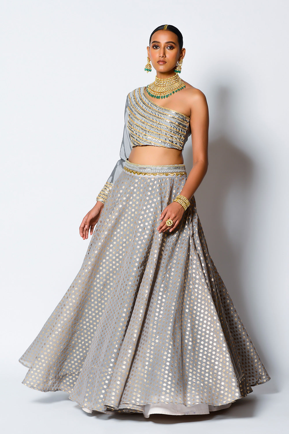 Featuring A One Arm Shoulder Blouse Paired With Chanderi Circular Skirt.
