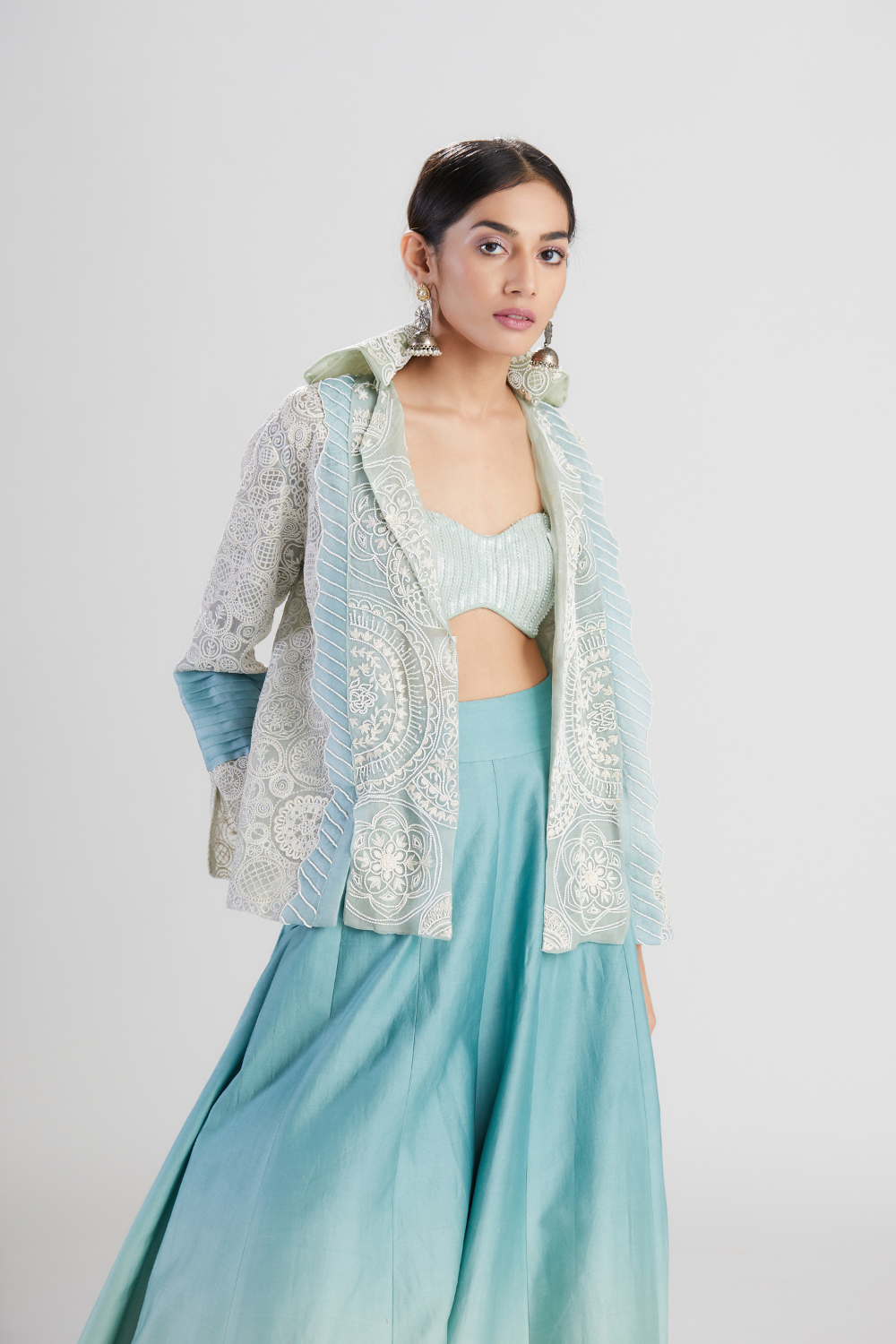 This look is a perfect mix of classic and contemporary. The subtle ombr on the deconstructed coat is a delight for the eyes. It features circular motifs with intricate work in them through out, hand embroidered with pearls and resham.It is further engineered with embellished organza trims.It is made in silk organza which makes it light for the wearer and has a subtle sheen.It is paired with an embellished bustier and a high waisted ombr chandheri skirt in hues of aqua and celadon, perfect for a resort wedding or a cocktail..