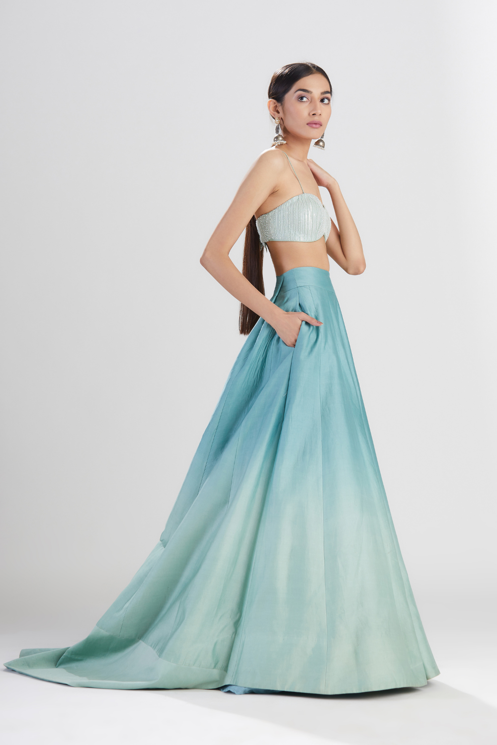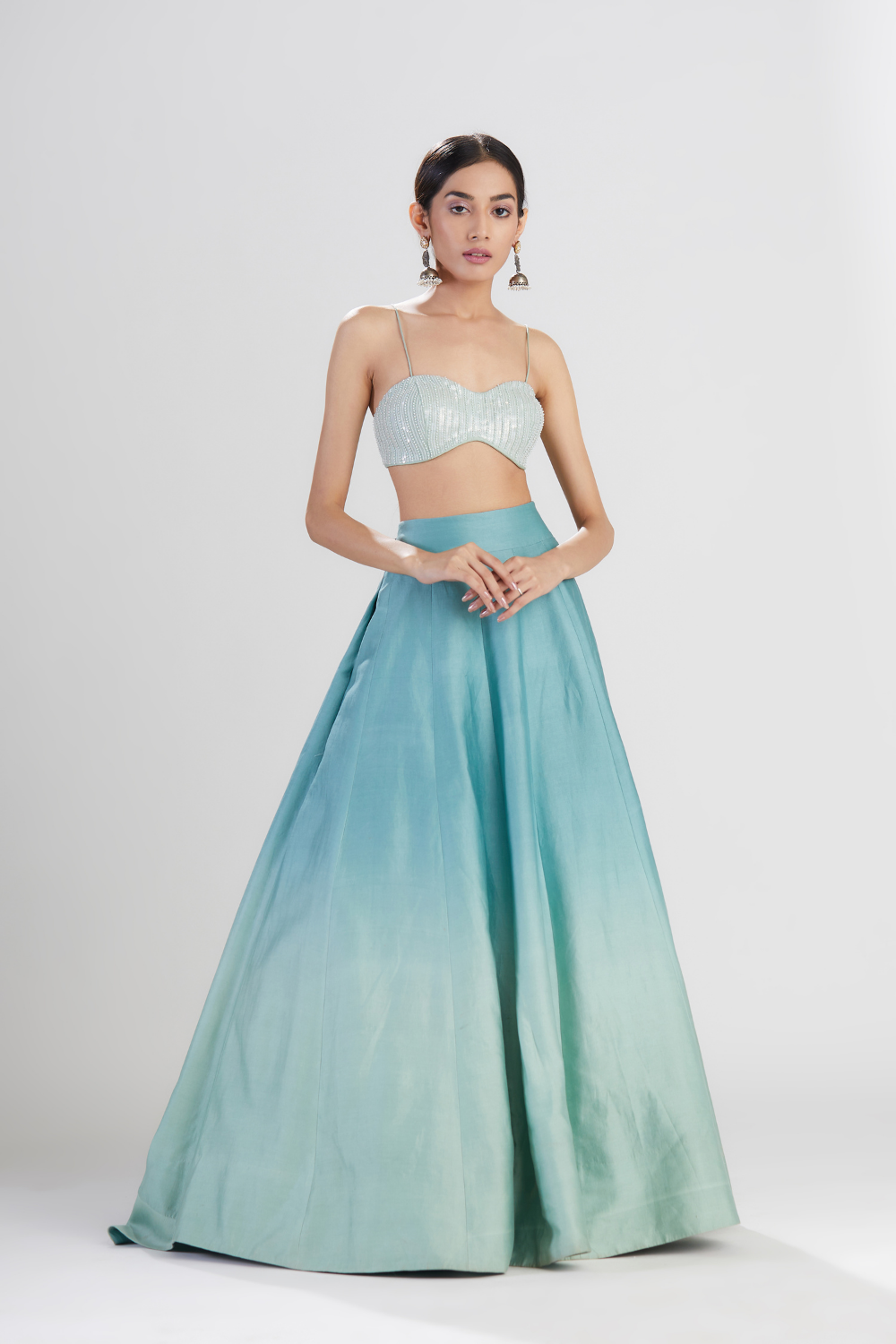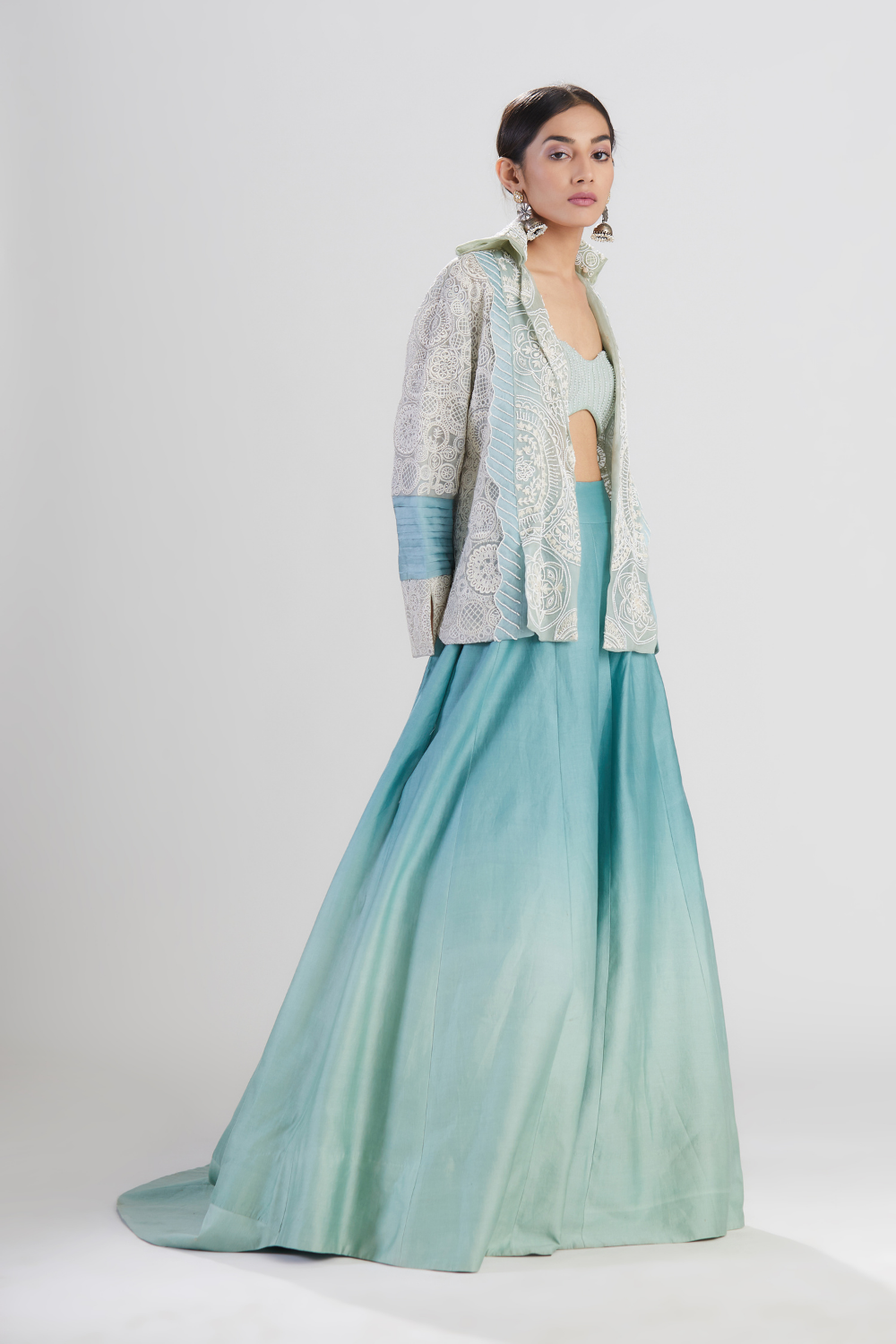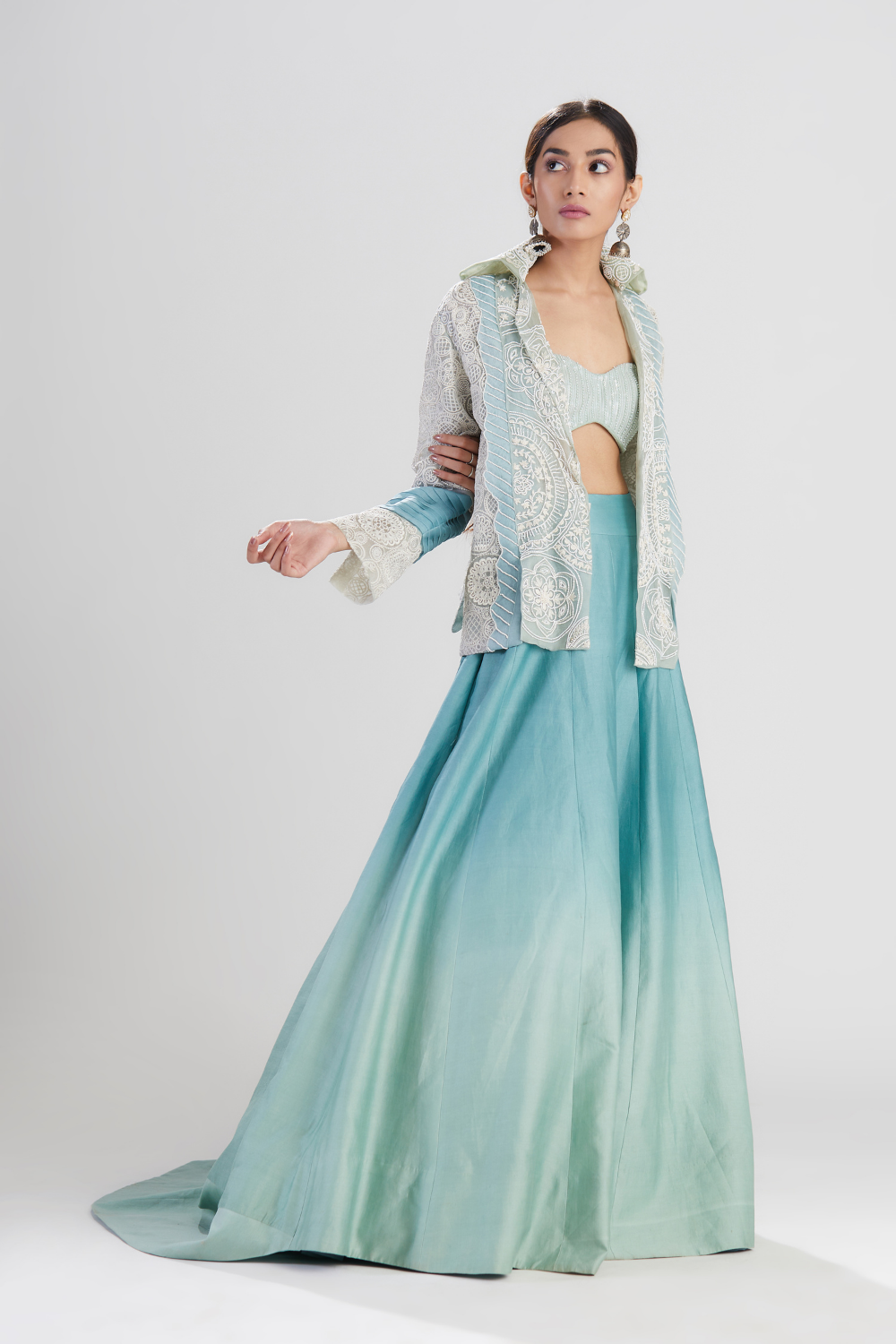Specification: silk organza jacket with detailed embroidery in silk threads silk, bustier in silk chanderi embroidered in fine sequinssilk chanderi skirt in aqua to celadon ombre