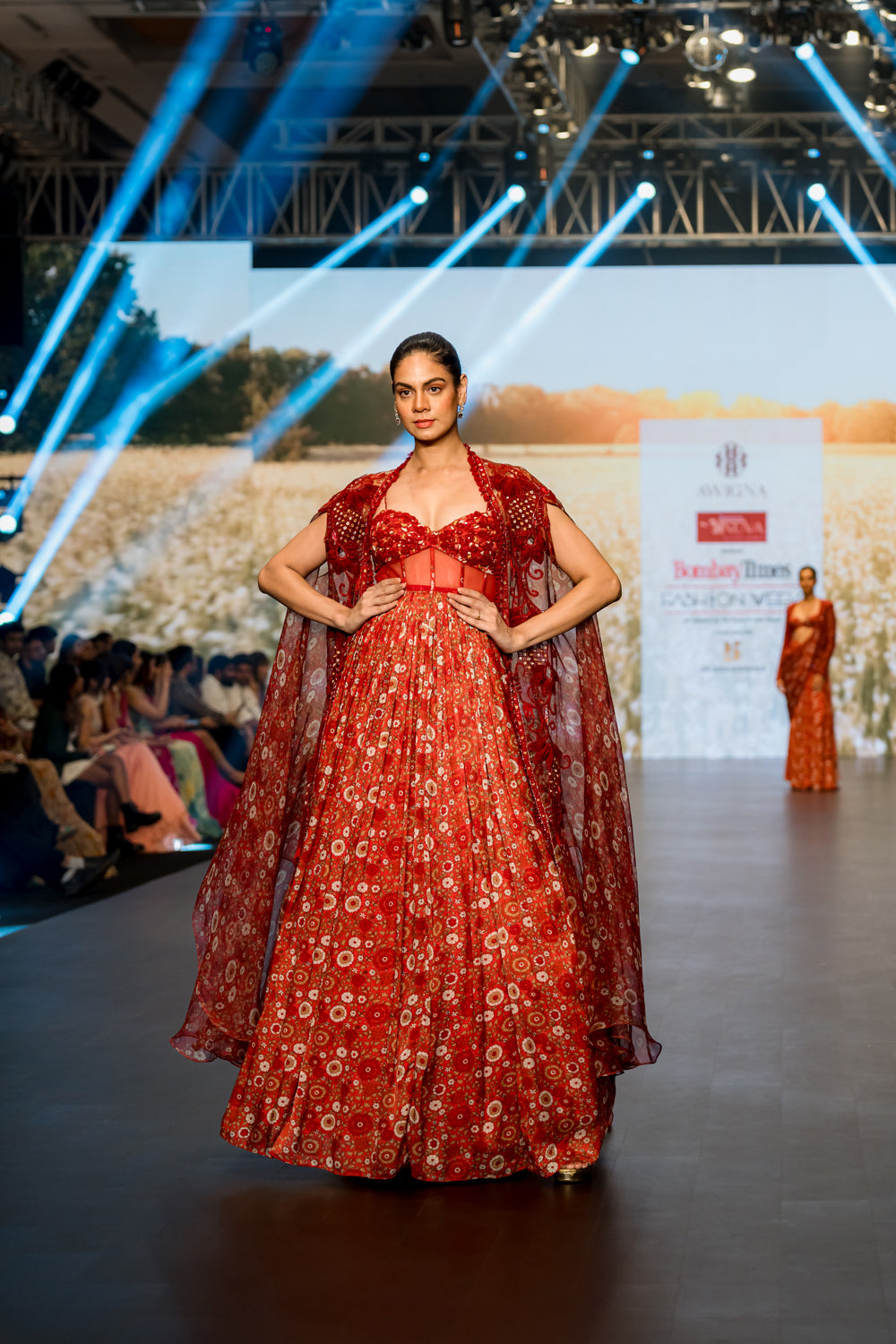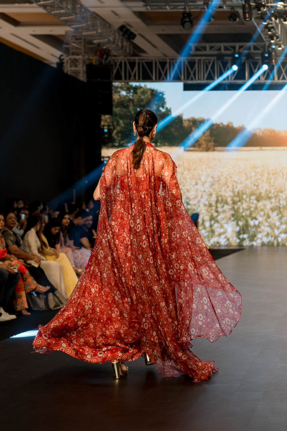 Red printed corset gown with detailed embroidery, layered with printed embroidered cape