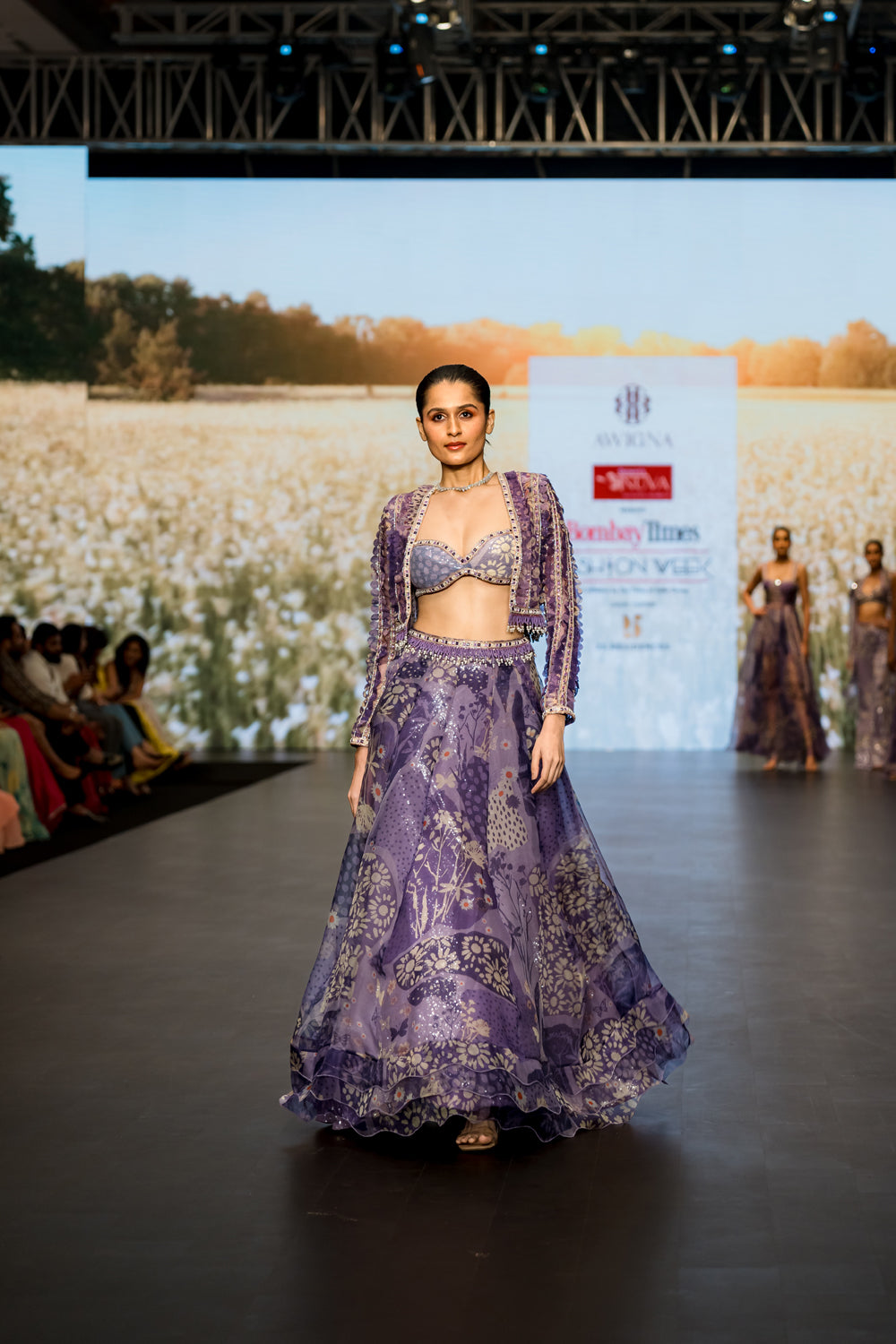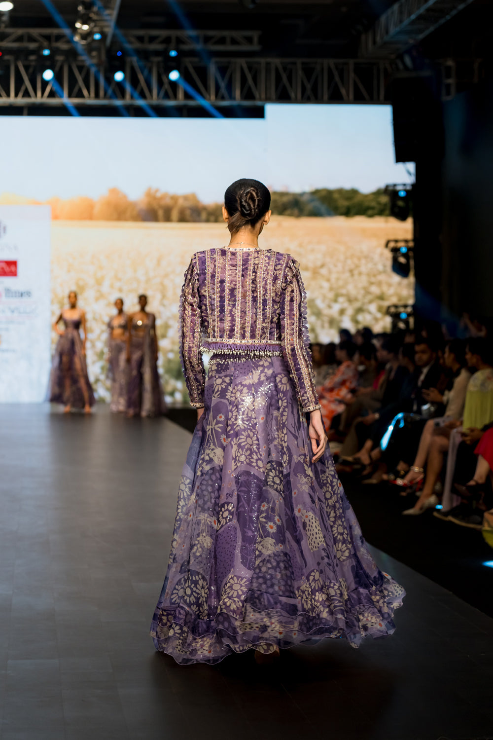 Purple printed skirt with embroidered belt, paired with embroidered blouse , layered with embroidered jacket