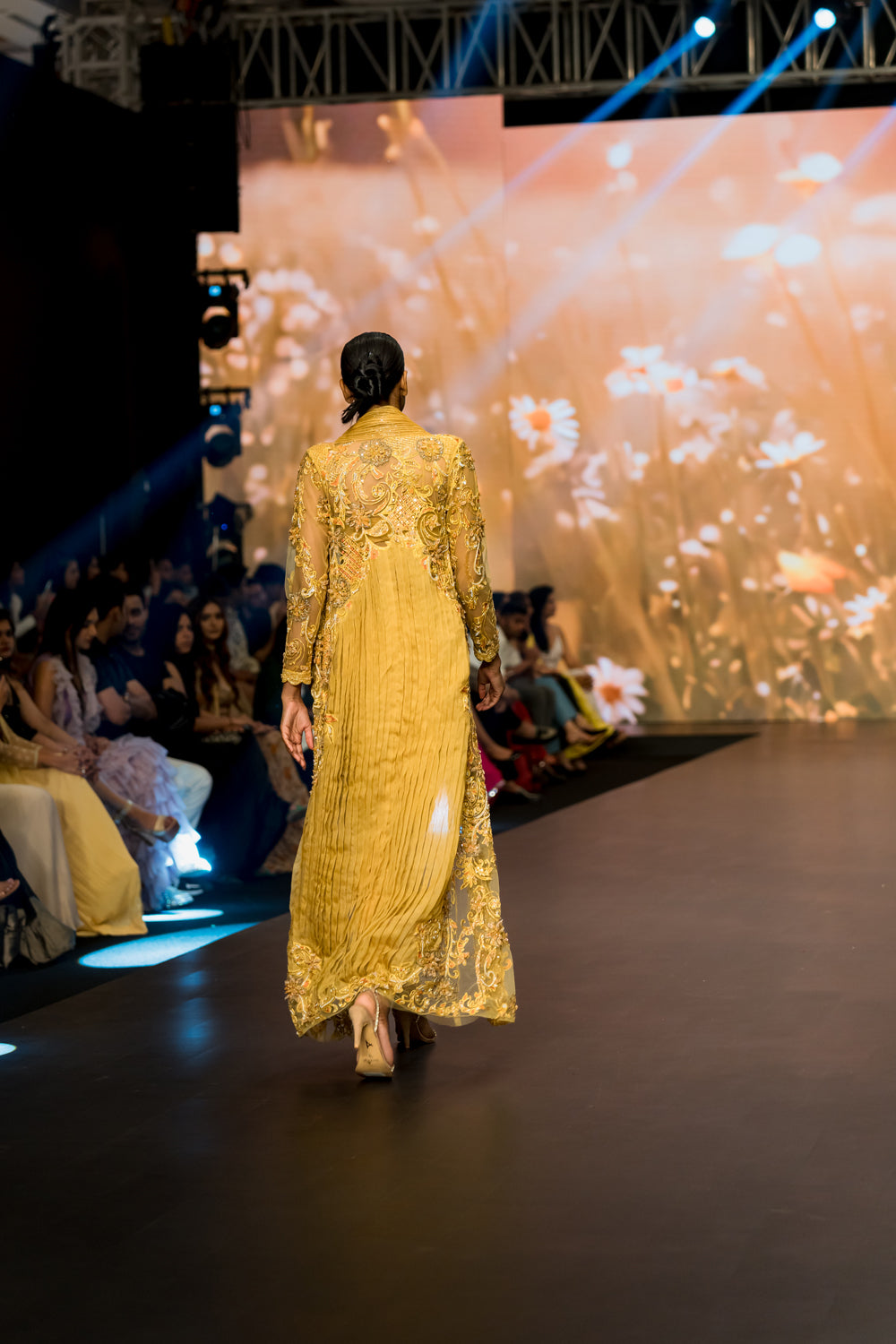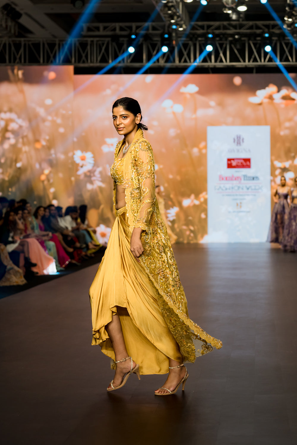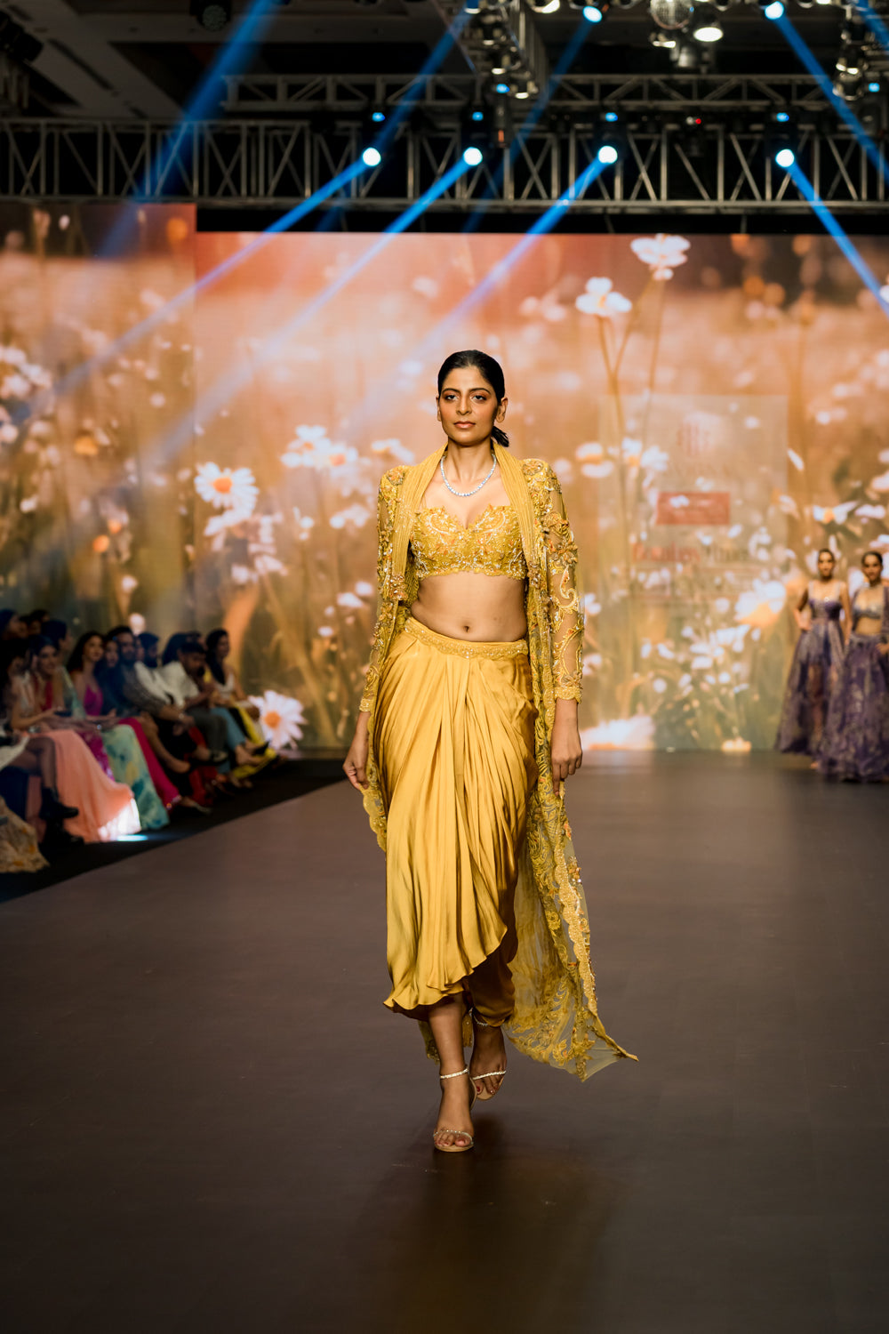Yellow heavy embroidered long jacket , paired with embroidered bustier and dhoti skirt with embellished belt