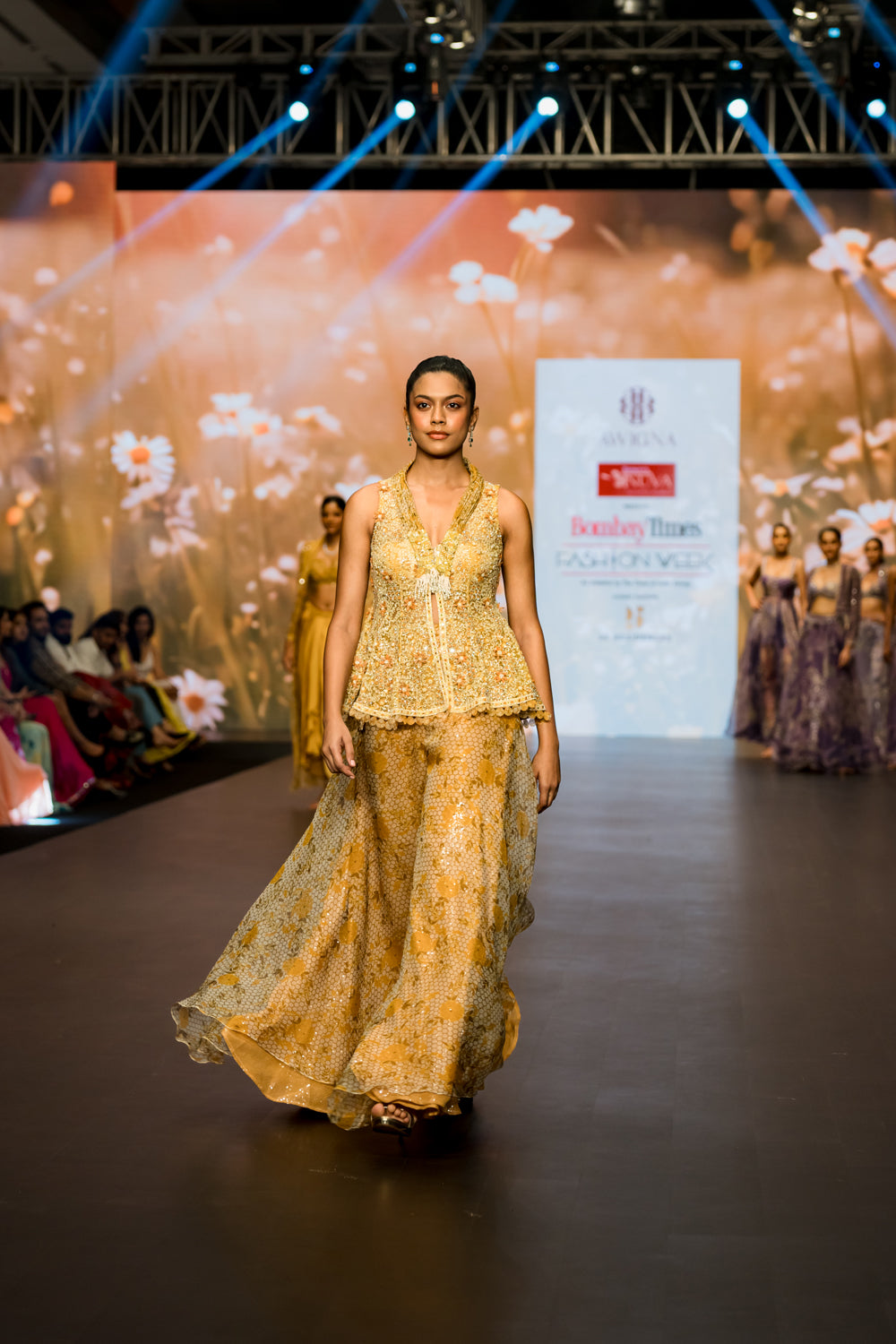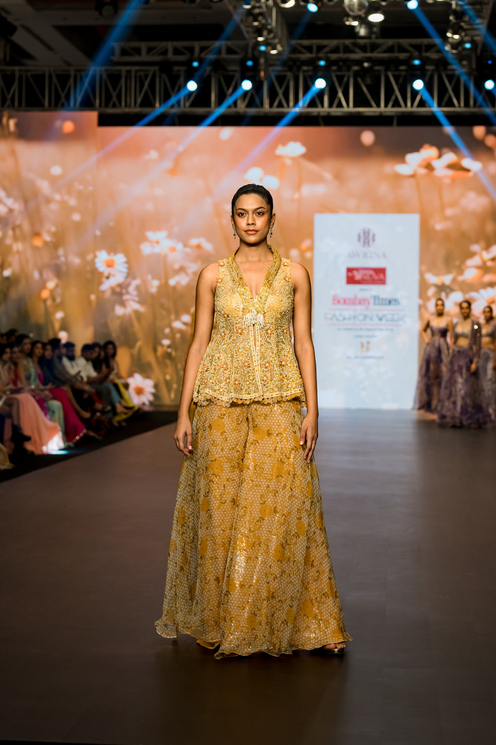 Yellow embroidered peplum with intricate details, paired with printed palazzo with sequence lining.