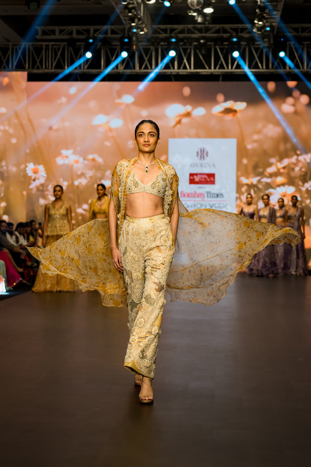 Ivory & yellow heavy embroidered pants and bustier layered with printed organza cape with intricate embroidery