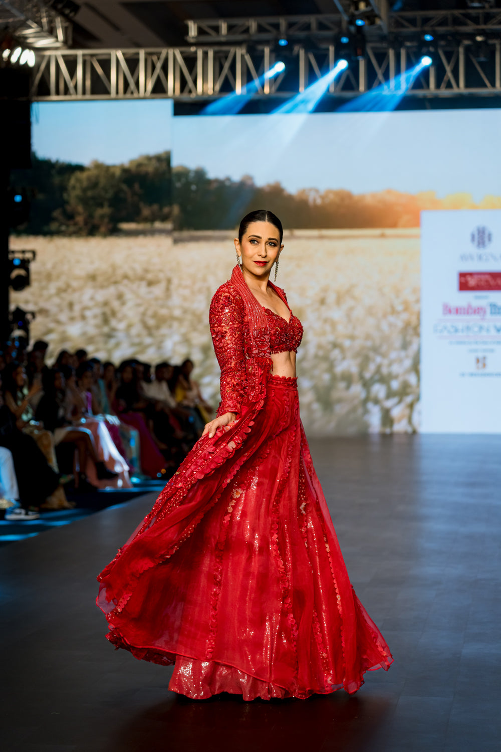 Coral red heavy embroidered long jacket with embellished collar paired with embroidered bustier and sequence lined organza skirt with lazer cut details.