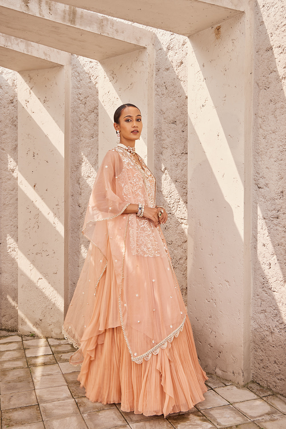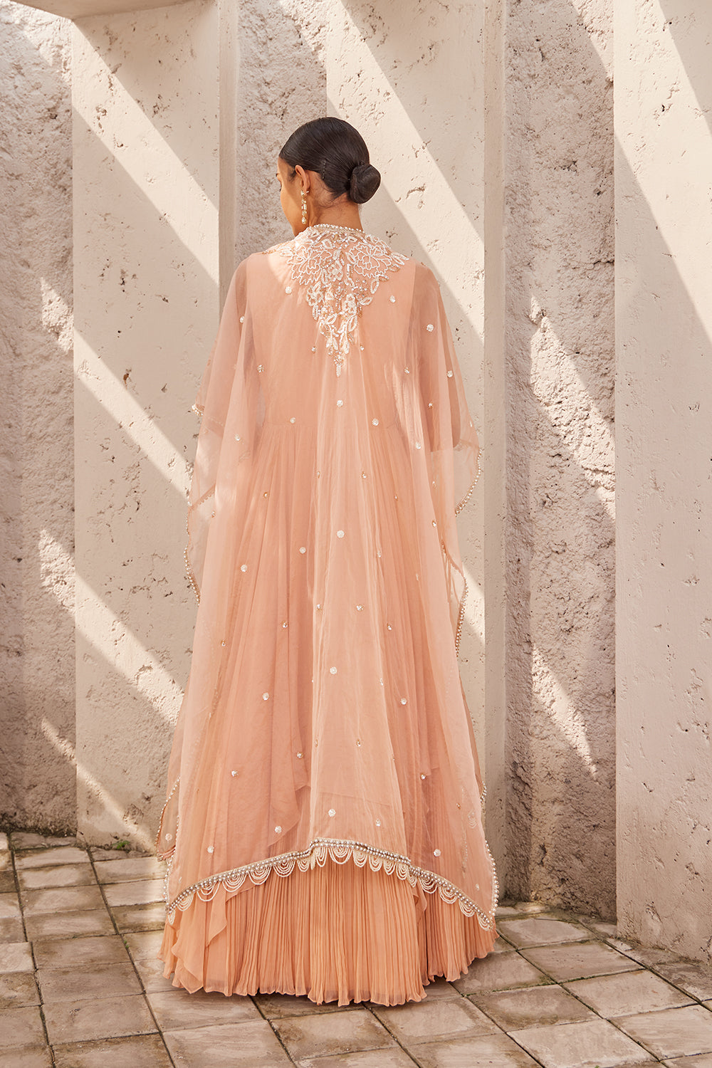This gorgeous champagne anarkali outfit has floral embroidery on the short kurta attached with the gathers. it has asymmetrical fall.the outfit is completed with the cape in cape there is floral embroidery in back.