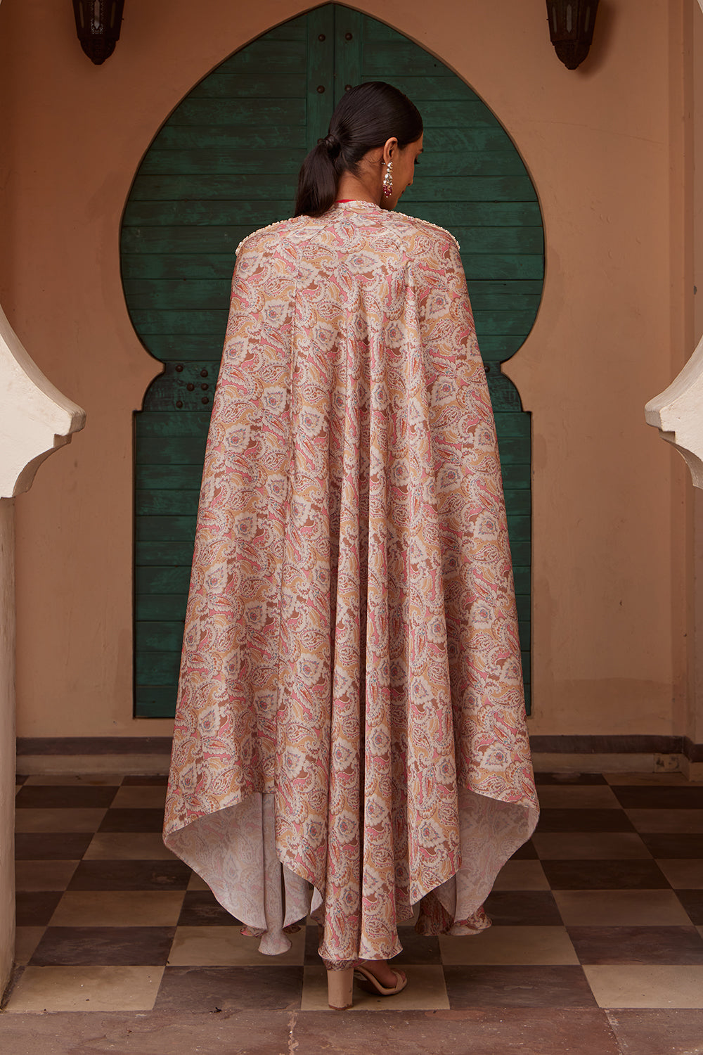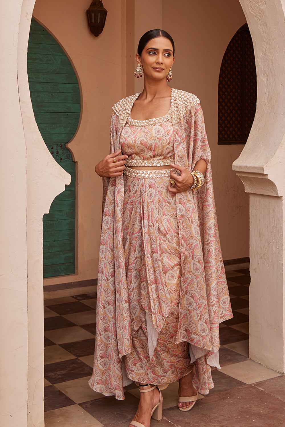 This outfit has cape in which there is embroidery on shoulders,beautiful printed blouse,and dhoti the whole has beige printed fabric .the outfit is padded and have concealed zip