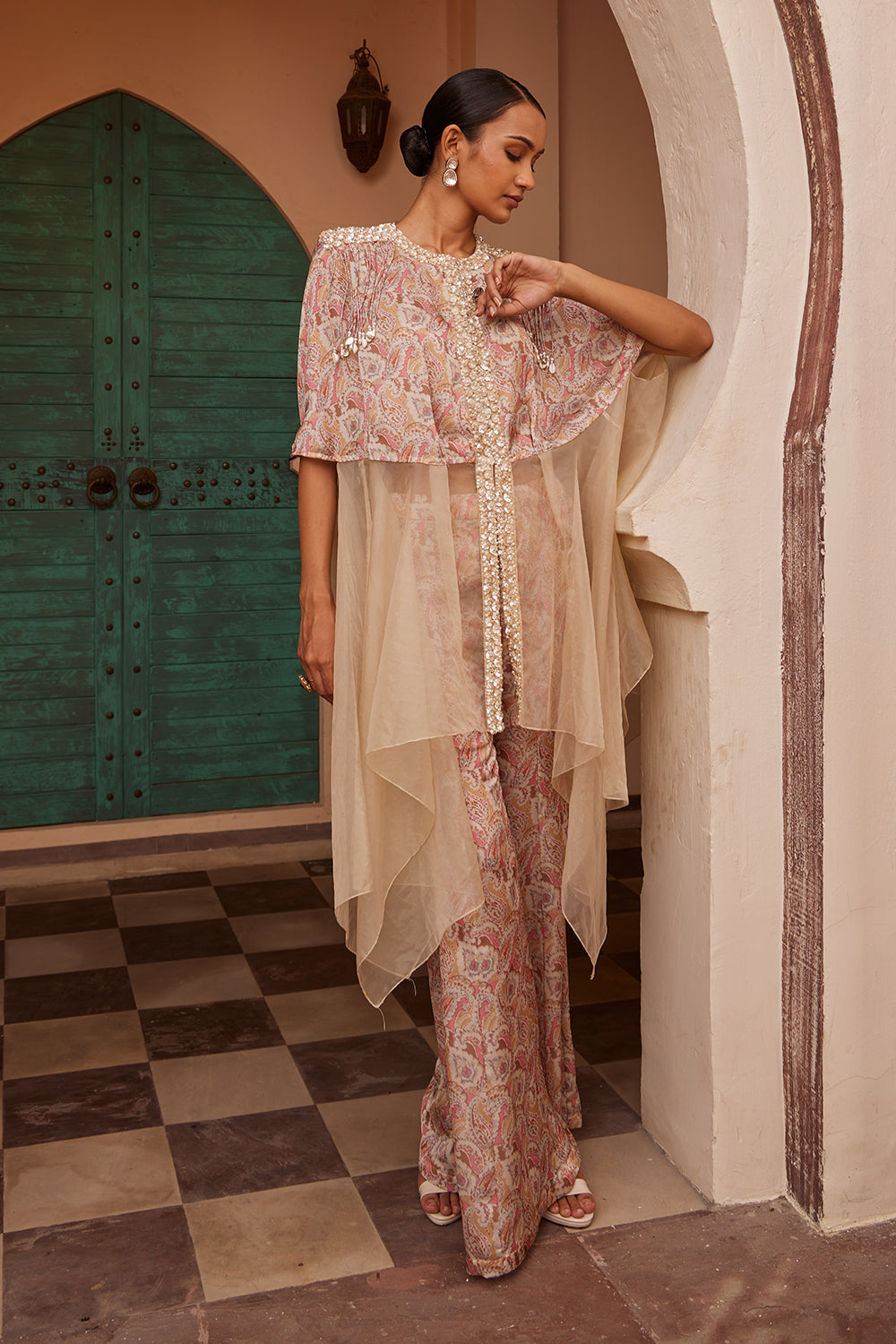 This gorgeous outfit has beige print kurta in kurta there is beige print in bust area and with organza it has asymmetrical drape join with bust area.in the front it has patch work of embroidery. with the same it has bell bottoms