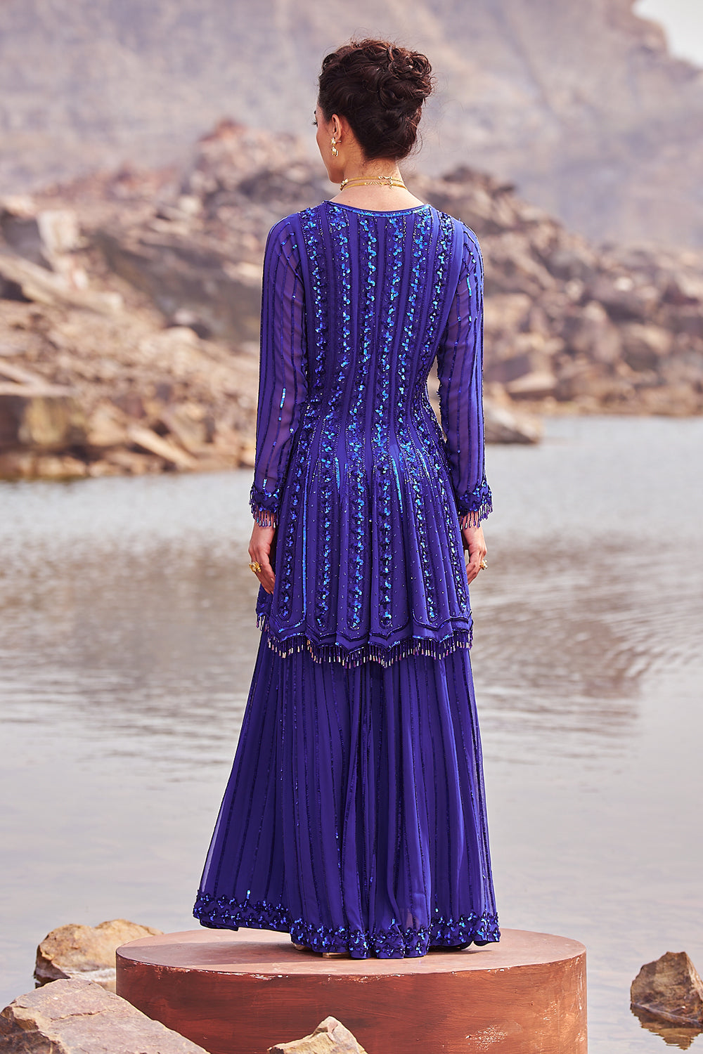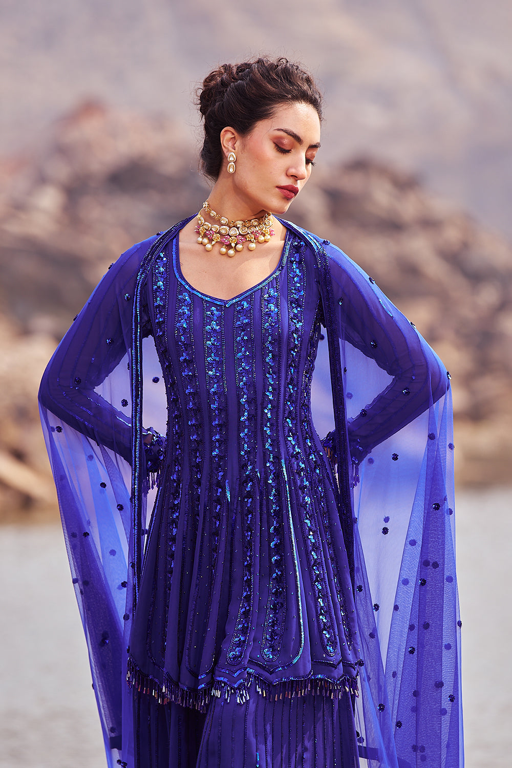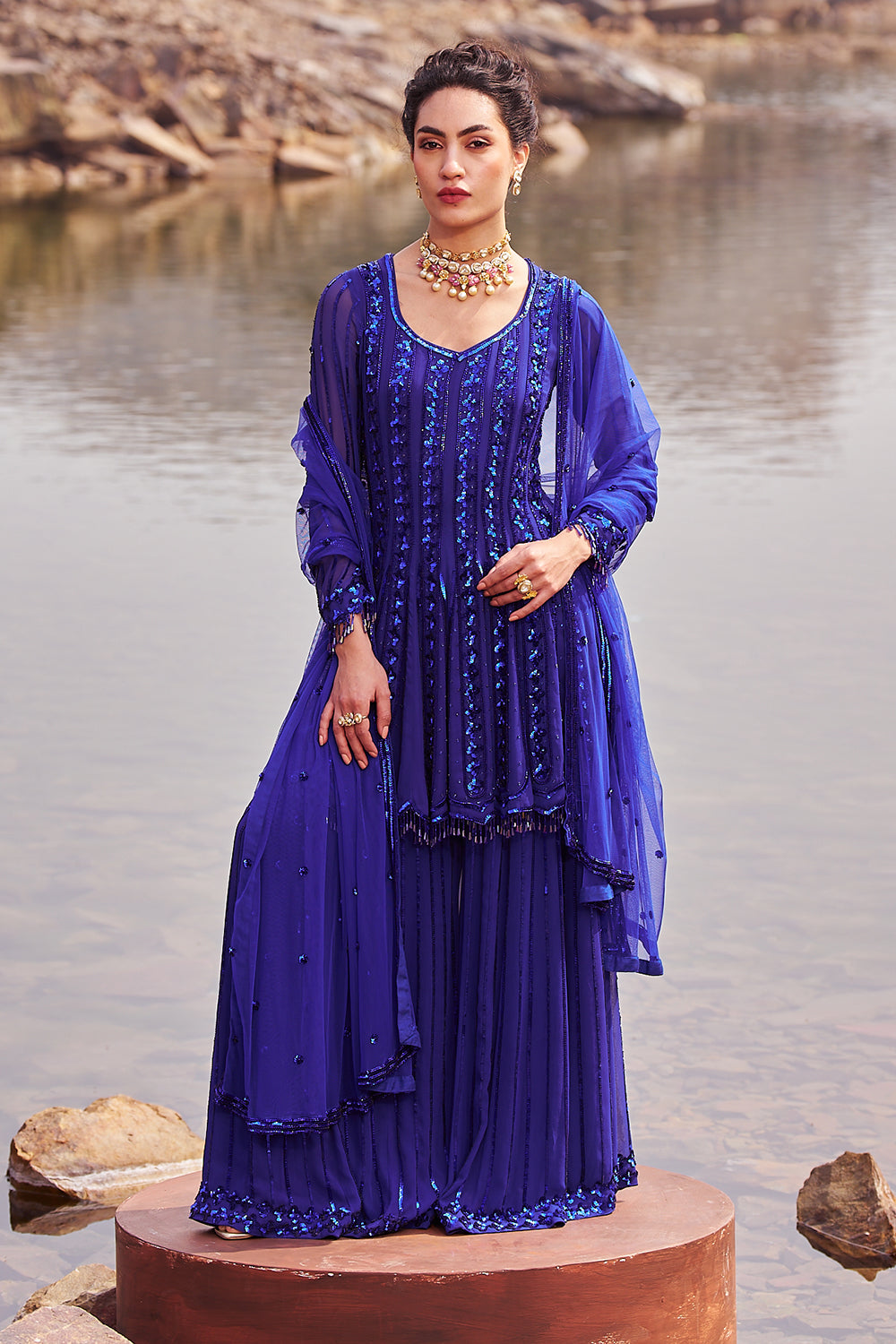 This gorgeous inky blue embroidered sharara paired with hand embellished kurta and net duppatta. the kurta have sweatheart neckline and concealed zip closure ._