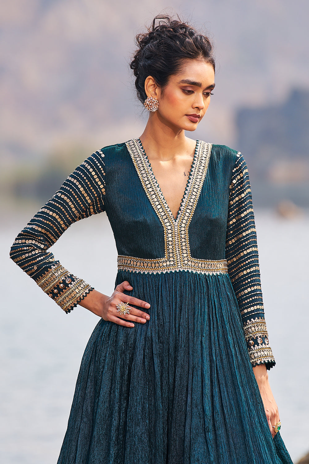 Bottle green floor length anarkali in crinkle fabric with flattering embellished neck line and gorgeous sleeves . outfit is non paded and have size zip closure . it completed with embroidered organza duppata.