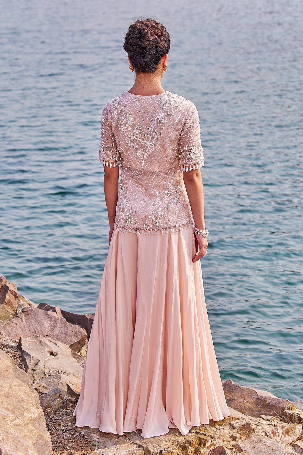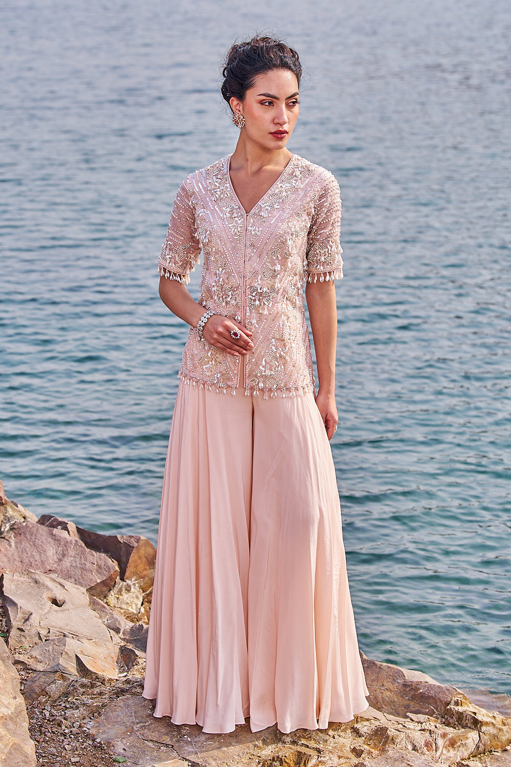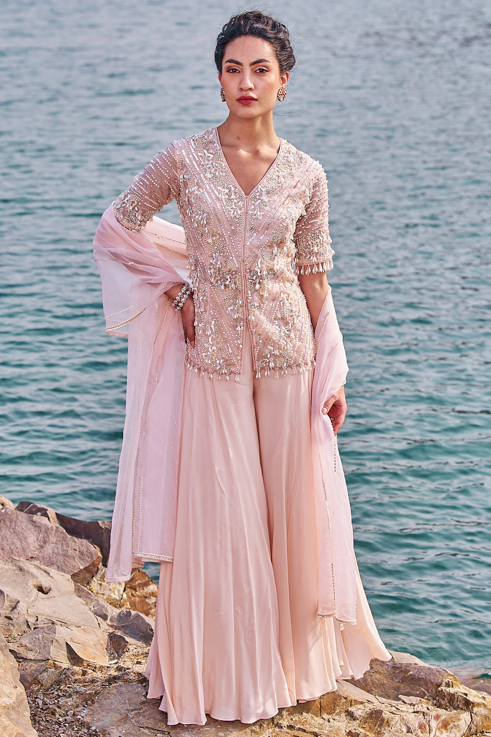 This gorgeous embellished short kurta in organza is paired with sharara in crepe . the kurta is meticulously crafted with sequences and pearl .it has a front hook opening .outfit completes with embroidered organza duppata.