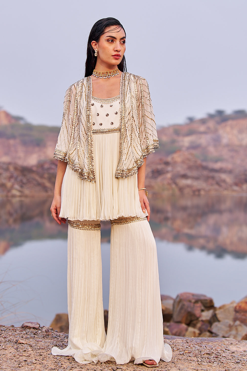 Firdose embellished sharara in gorgette comes with a short kurta which is hand crafted with sequince , beads and pipe work. it has a flaterring u wide neckline and have a side zip closure. outfit completes with embroidered gorgette cape with tassel detailing.