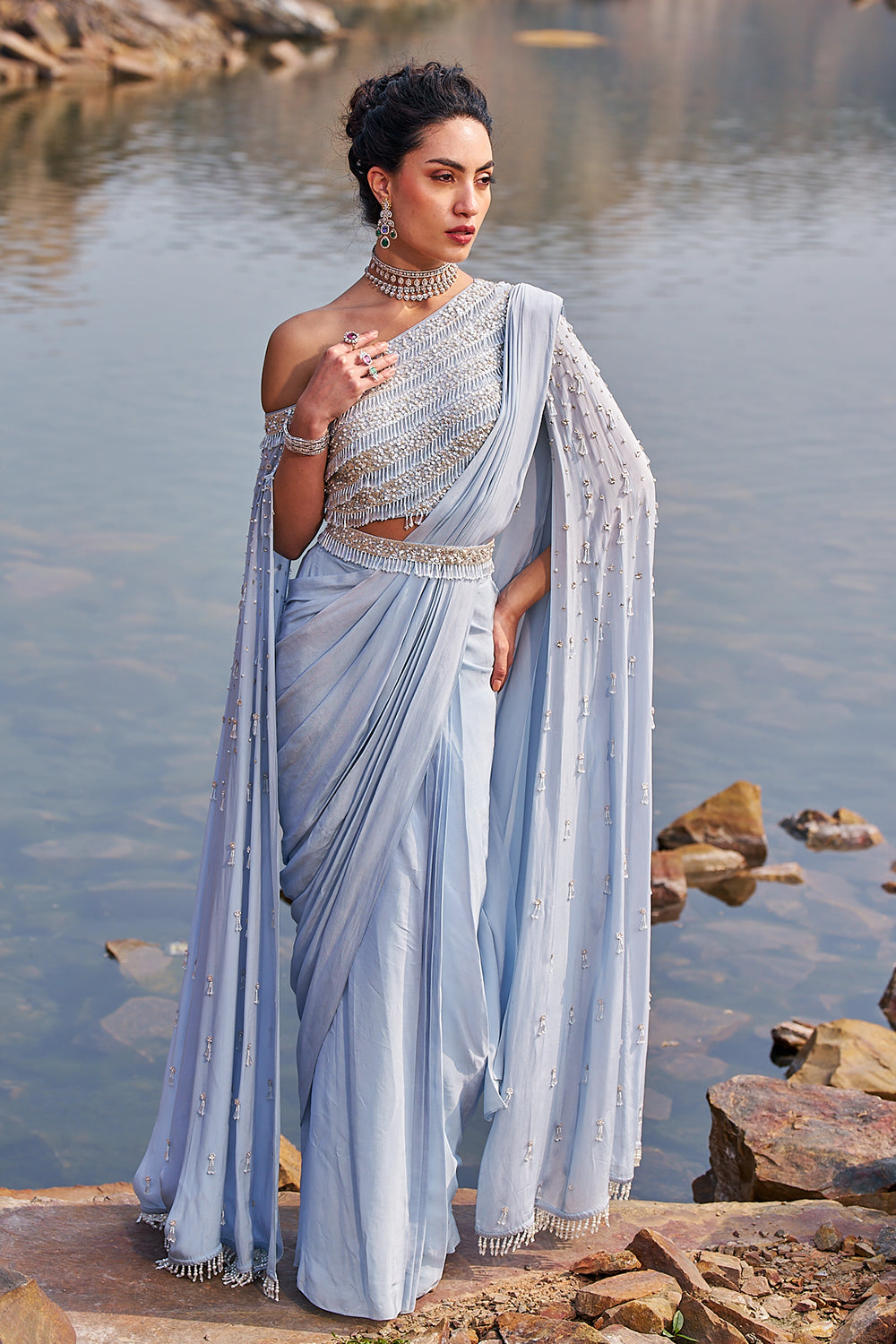 Refreshing aqua drape embellished saree in crepe paired with stunning cape oneshoulder blouse .its intricately hand crafted with crystal drop , its padded and have a back hook closure.