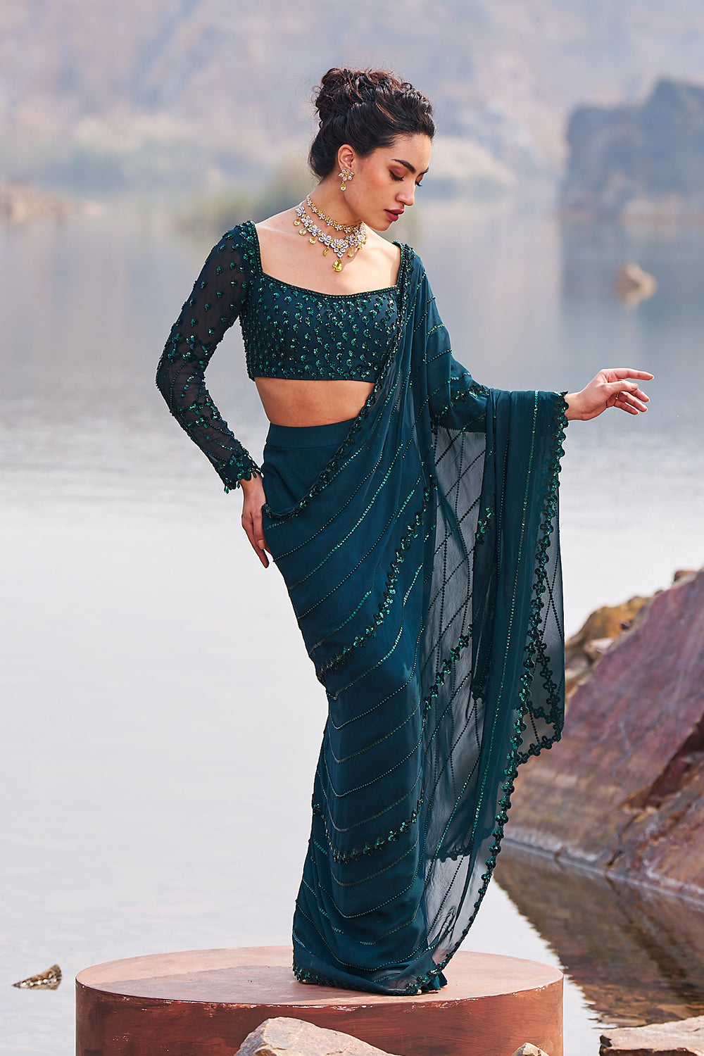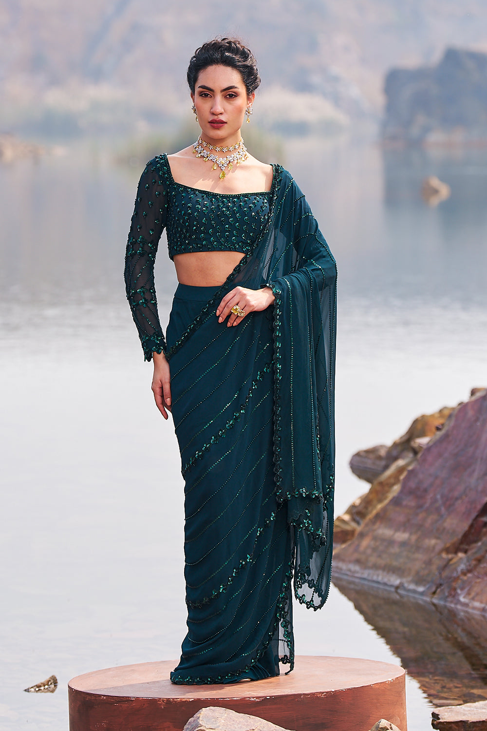 Bottle green jilmil drape saree has beautiful embellished pallo and it is paired with embroidered tone on tone blouse. the blouse have a gorgeous wide u neck line , its padded and have back hook closure.