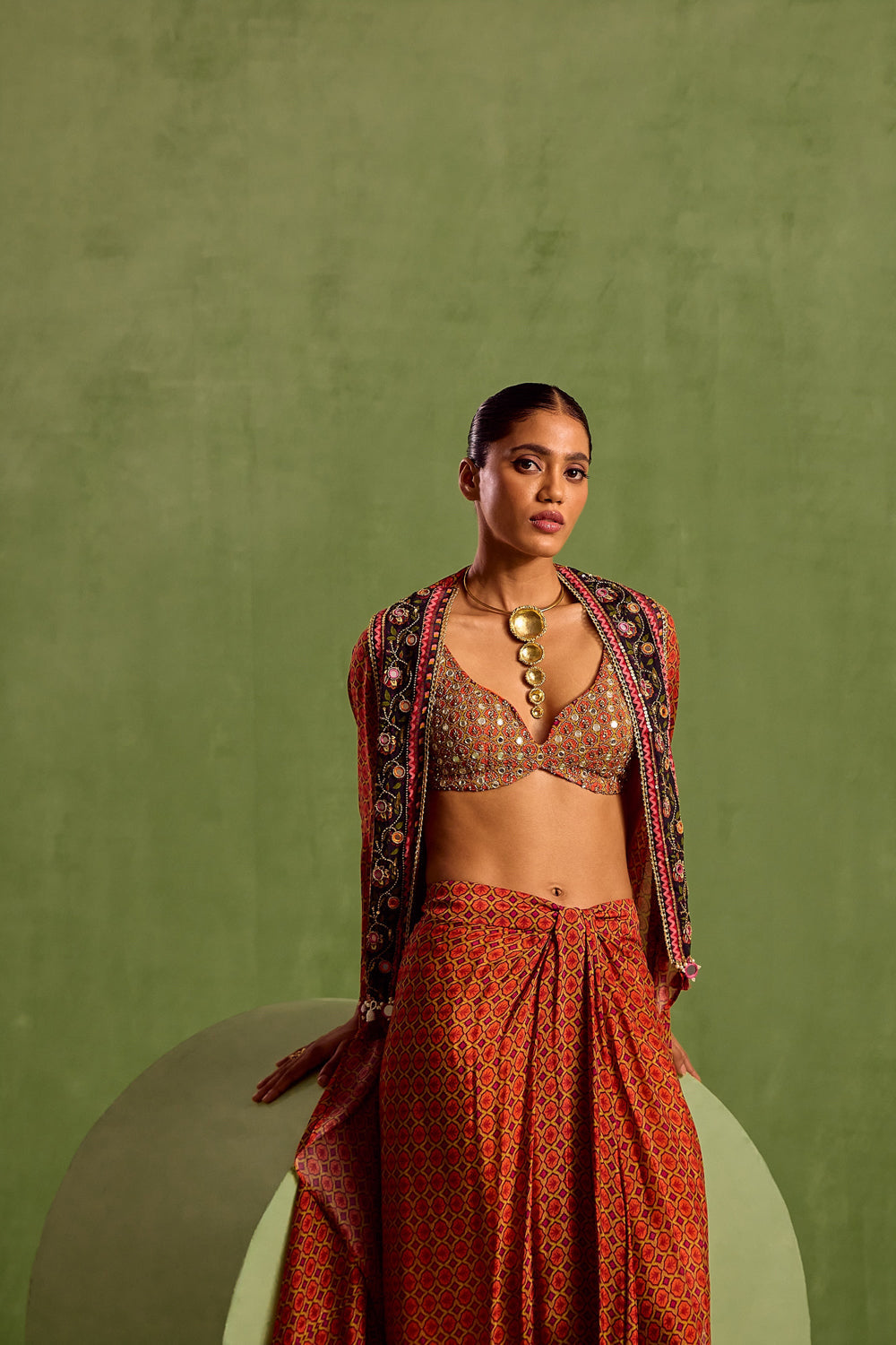 Orange draped skirt with geometric print. Comes with zari embroidered border asymmetric cape embellished by beads and mirrorwork. Paired with bead embellished padded blouse.