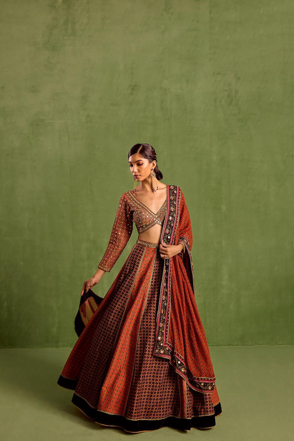 Orange Viscose Raw Silk Floral Geometric Printed Panelled Lehenga Set