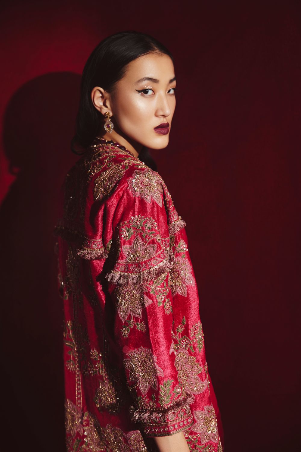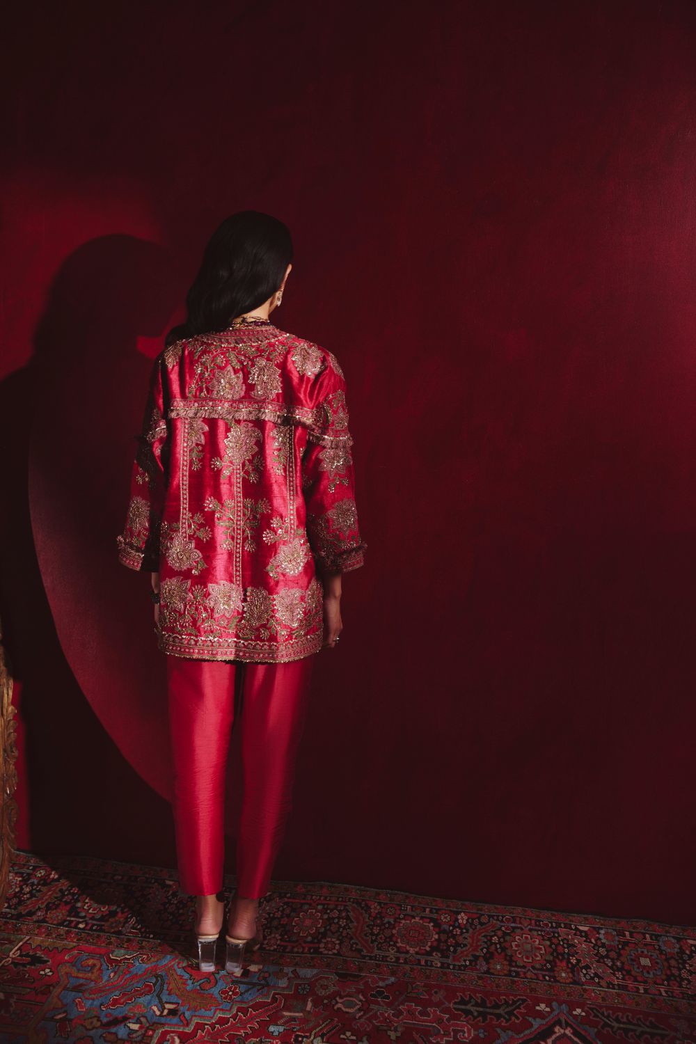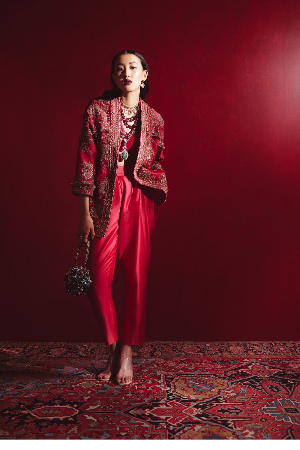 Cherry red raw silk embroidered jacket and fine silk pants with bustier