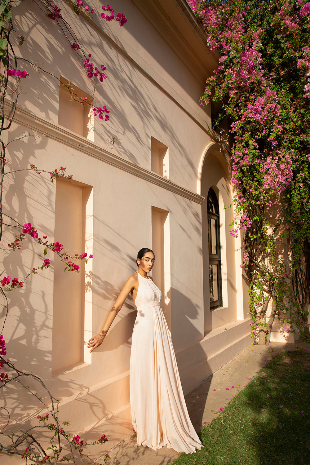 Champagne halter neck draped gown with pearls