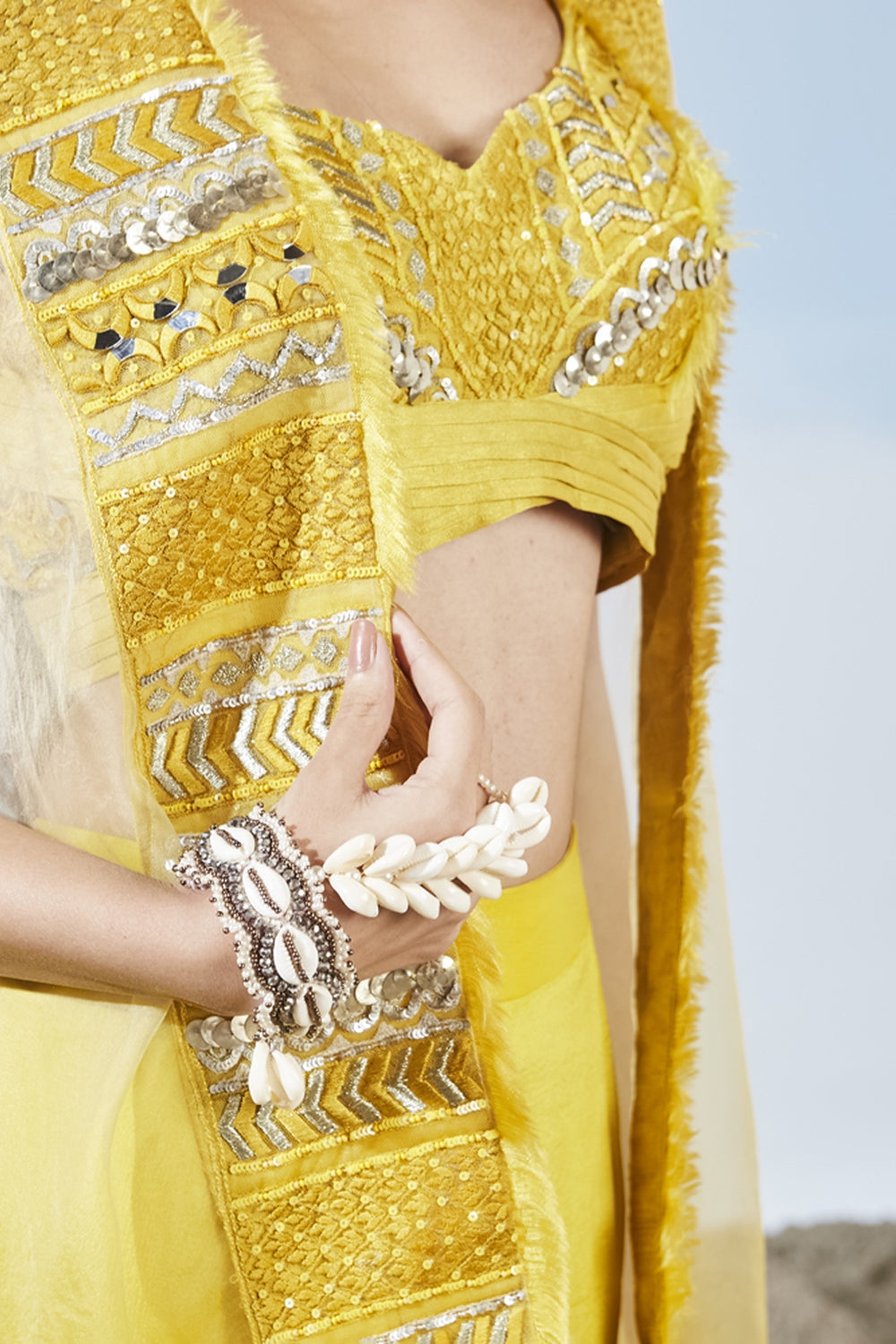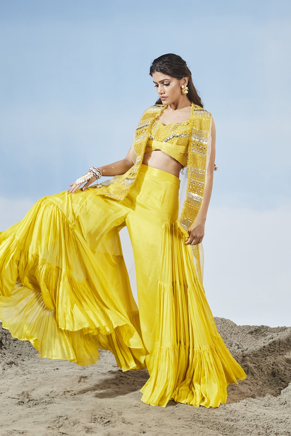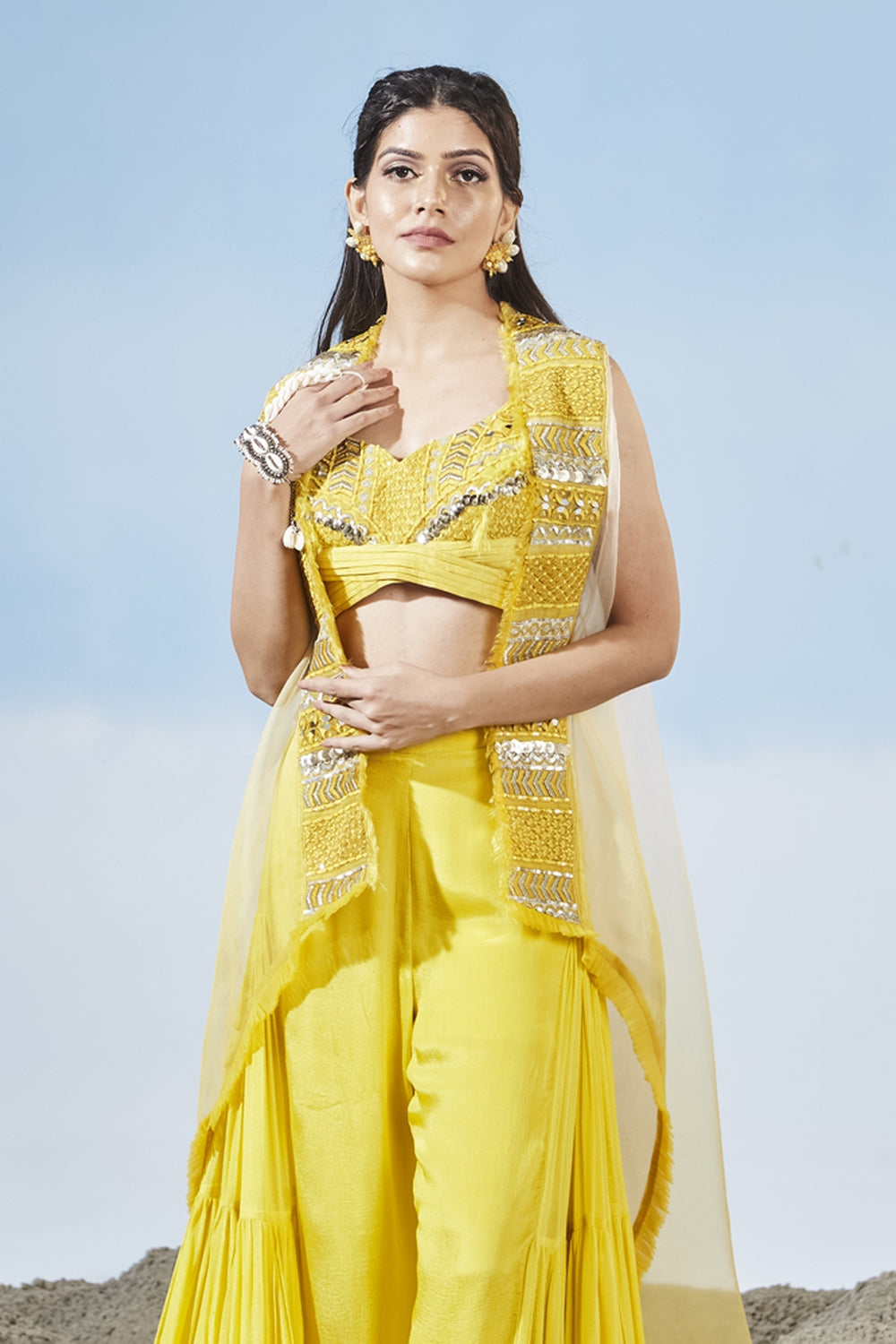 Embroidered blouse paired with signature side-pleated pants and an organza high-low cape
