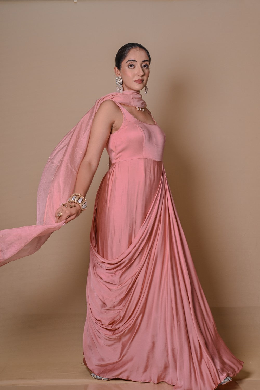 - Satin draped sleeveless gown.