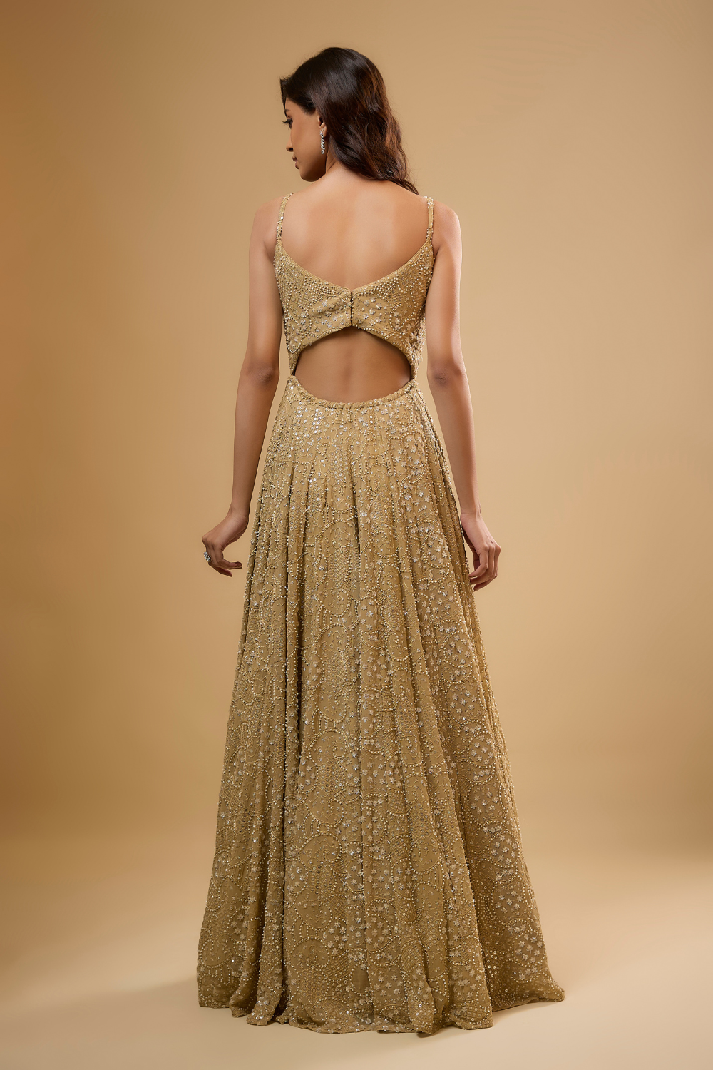 This set features a champagne gold georgette anarkali gown set. The ensemble has a strappy round neckline with a back cutout at waist. It is embroidered all over with ivory sequins, glass beads and threadwork in an abstract pattern. A matching net dupatta with embroidered border completes the look. Cancan is included.
