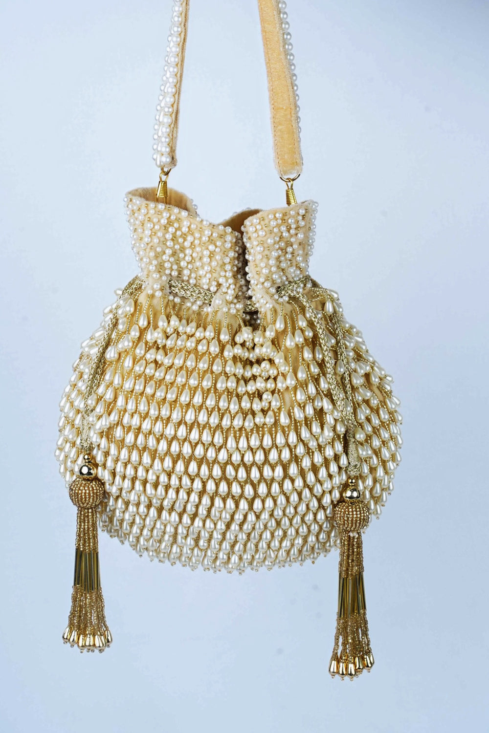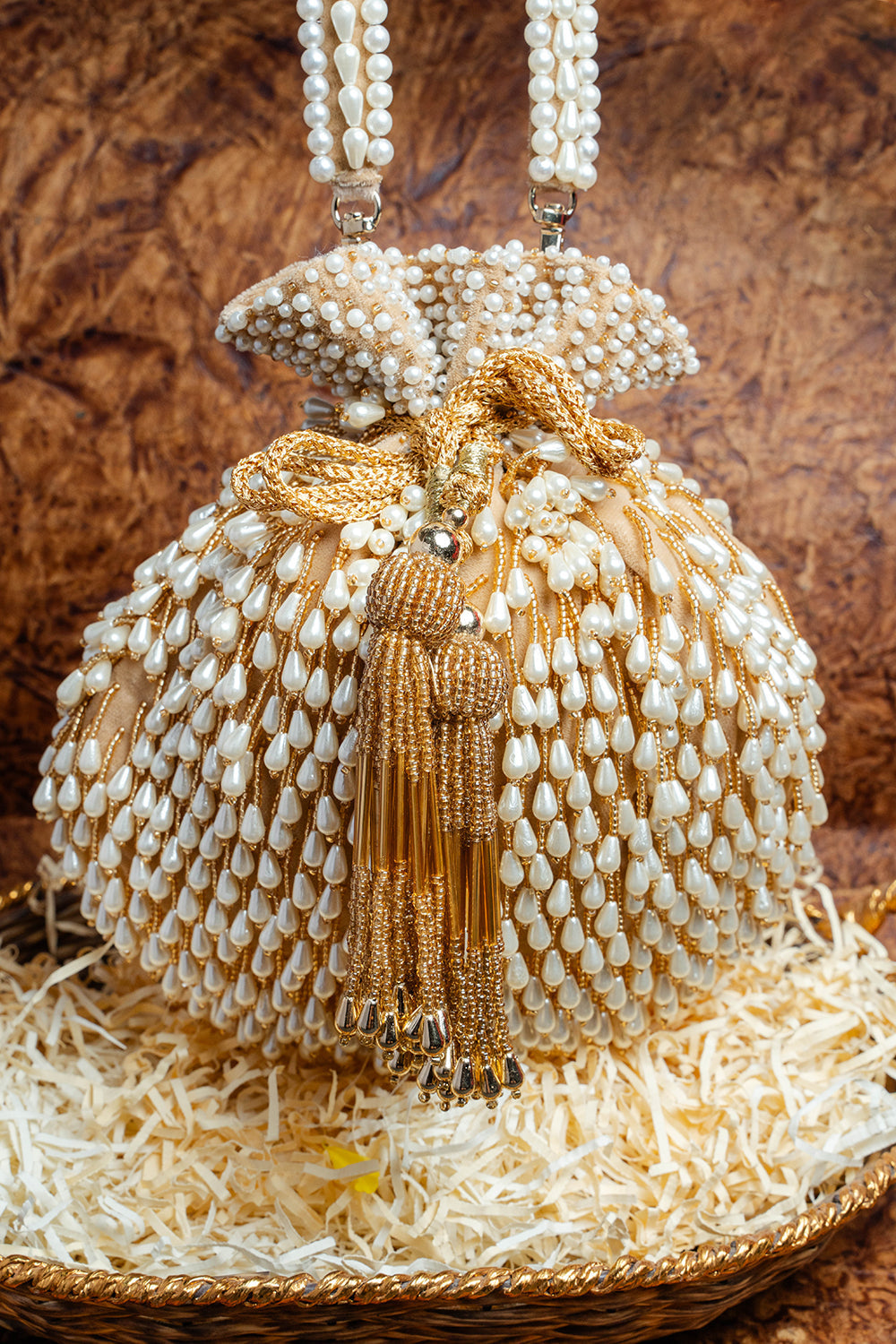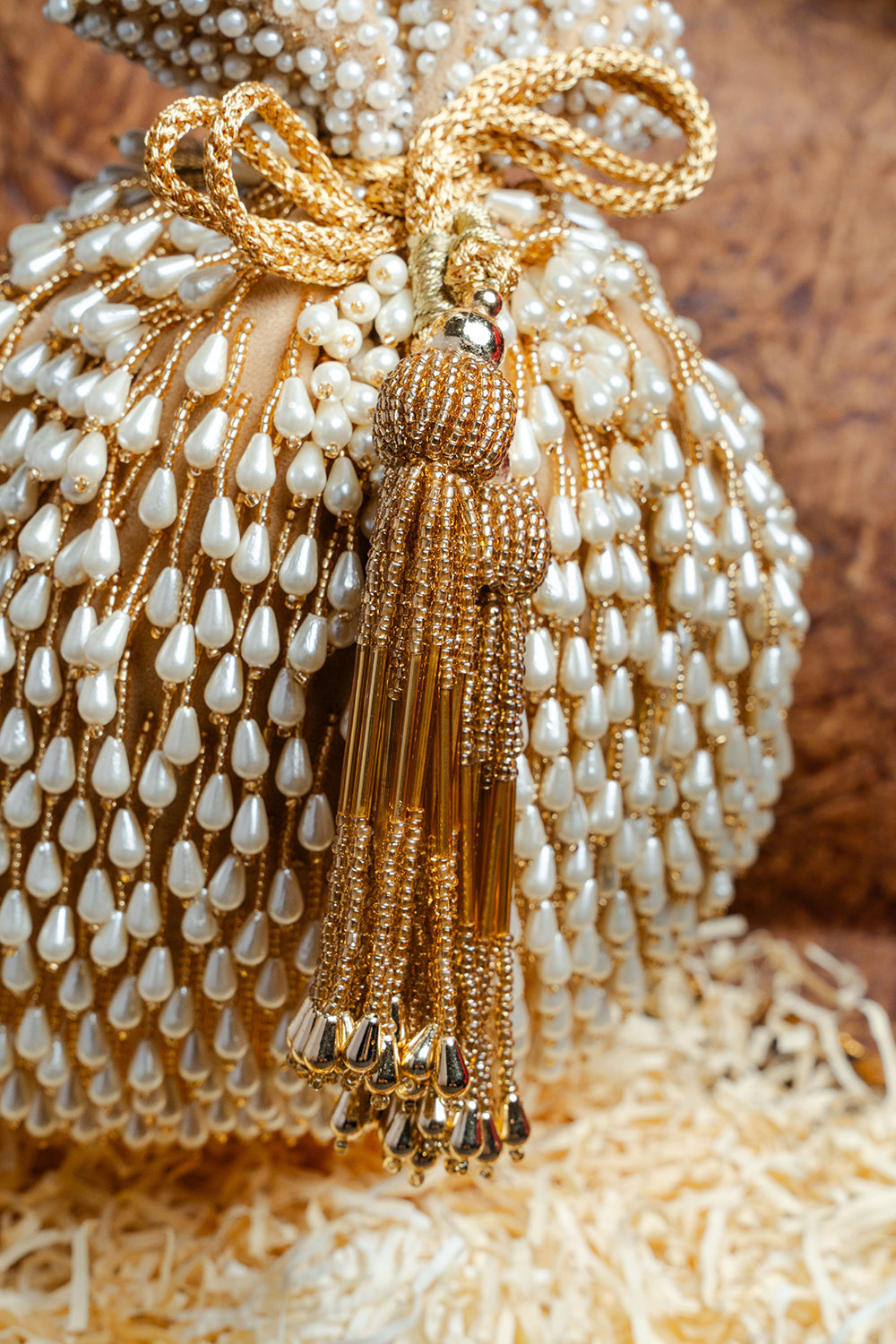 An exquisite fusion of tradition and elegance. This potli features a captivating mix of pearl tassels, delicate beads, and detailed pearl work in a gold palette. Accented with luxurious pearl finishing , this potli is designed to add a touch of sparkle and sophistication to any special occasion.