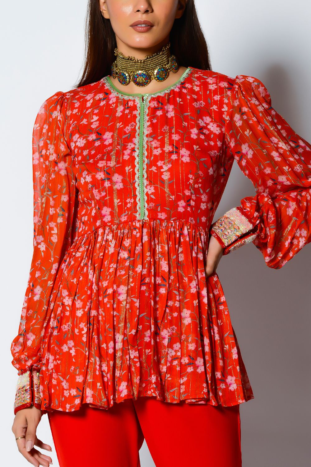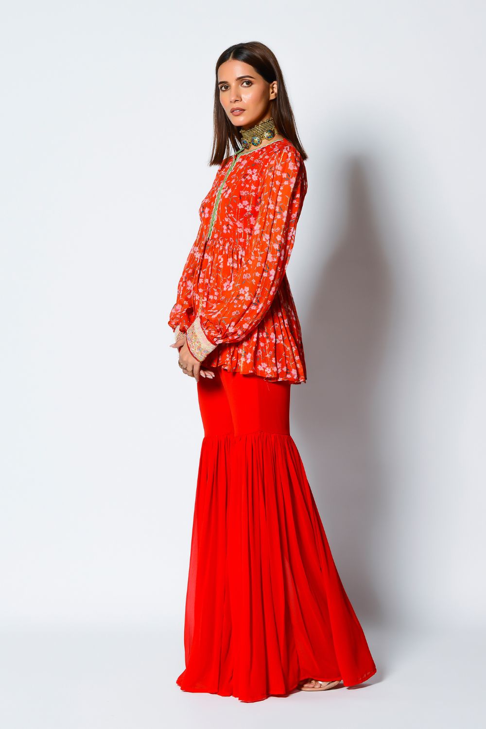 Featuring a paprika red georgette Peplum top paired with gharrara enhances at aplique work at neck and embrioded cuff.